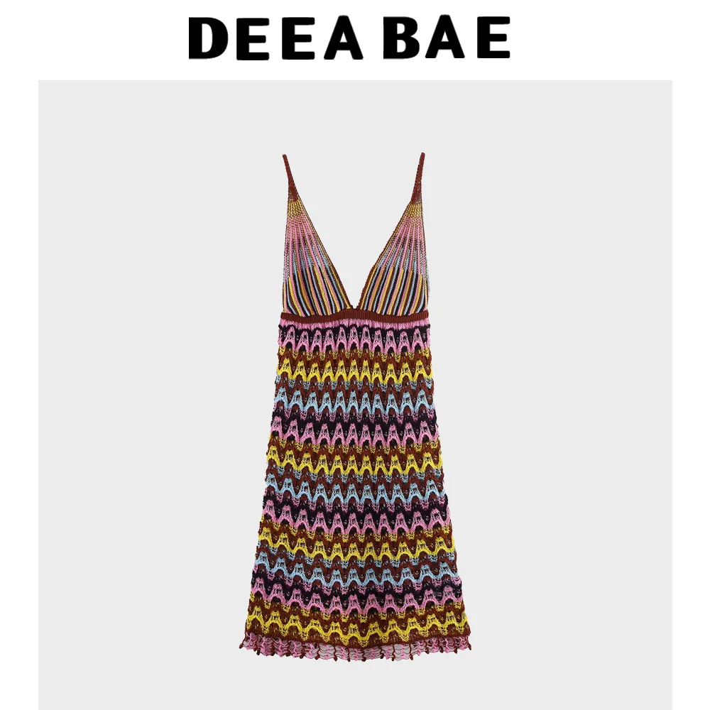 DEEABAE 2025 Summer New Women’s Fashion Western Style Sexy Bareback Hollow Out Slimming Knitted Mini Dress