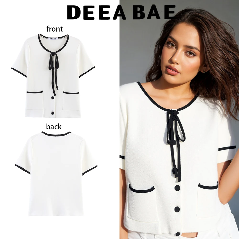 DEEABAE 2025 Summer New Women's Sexy and Fashionable Cross Color Edge Round Neck Short Sleeve Knitted Coat
