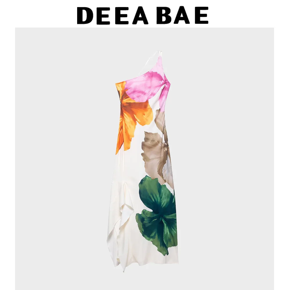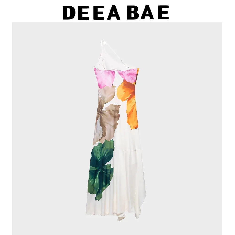 DEEABAE 2025 Summer Women’s European And American Sexy Strap One Shoulder Dress Printed Sleeveless Split Back Irregular Skirt