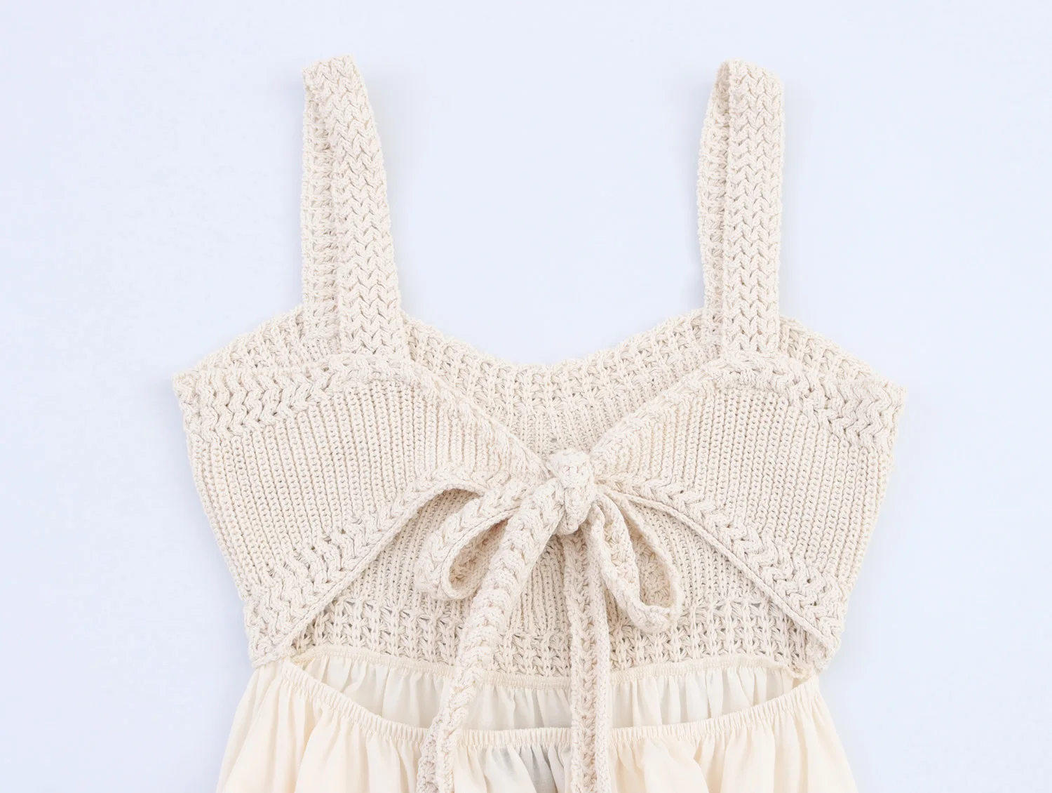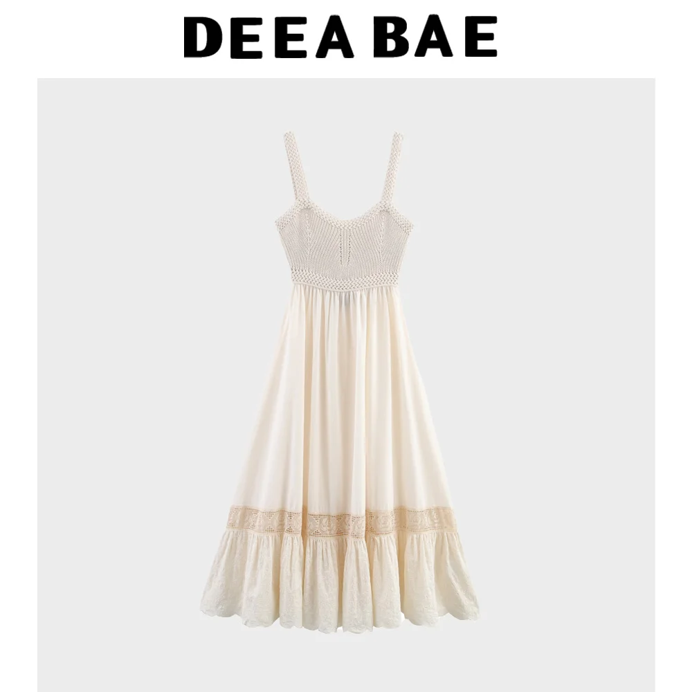 DEEABAE 2025 Summer Women's French Knitted Splicing Skirt Beige backless Long Embroidered Bow Strap Dress
