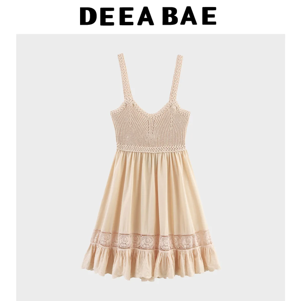 DEEABAE 2025 Summer Women's French Knitted Splicing Skirt Beige Bareback Short Embroidered Bow Strap Dress