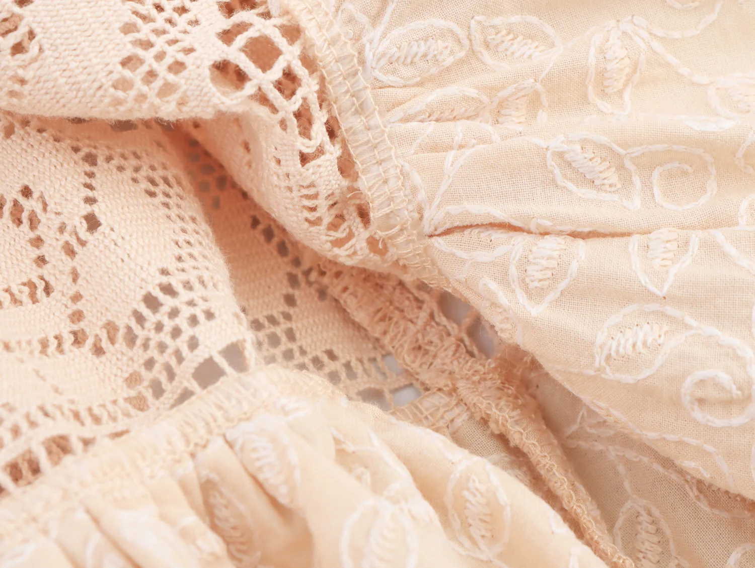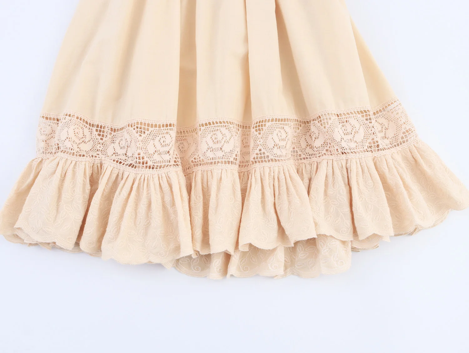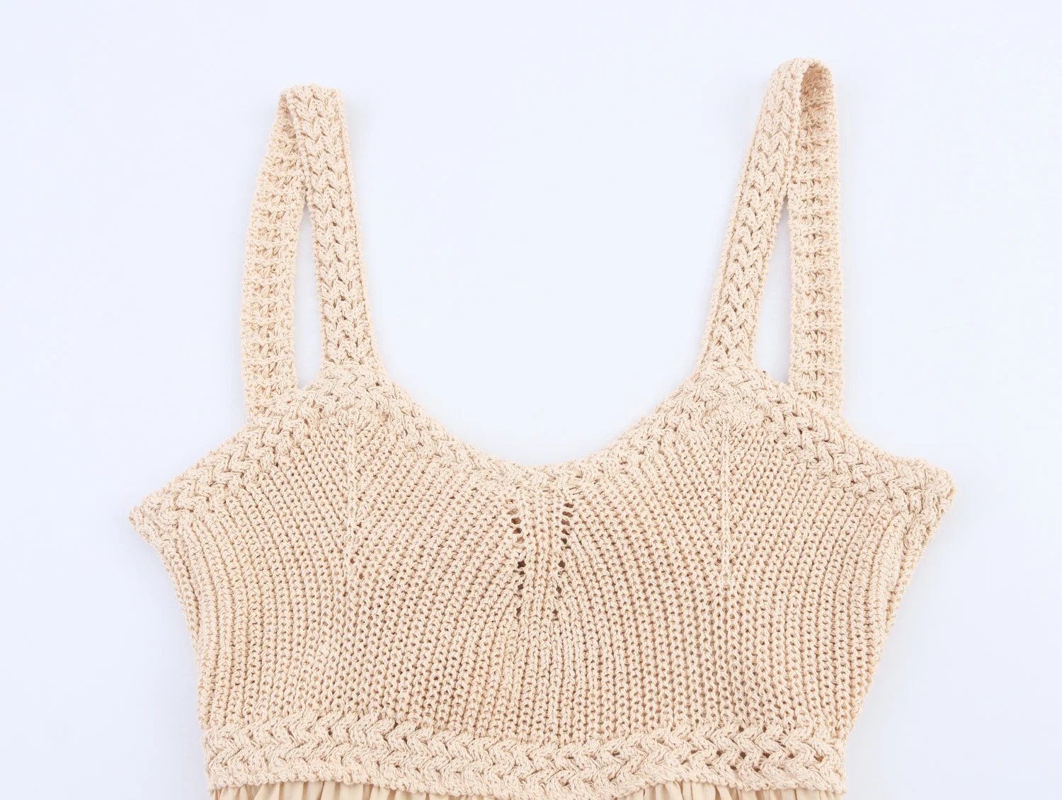 DEEABAE 2025 Summer Women’s French Knitted Splicing Skirt Beige Bareback Short Embroidered Bow Strap Dress