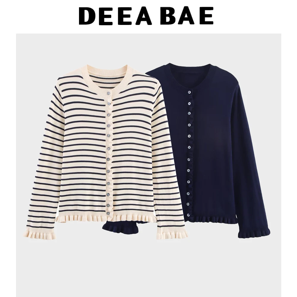 DEEABAE Autumn new simple round neck long sleeved striped knitted cardigan slim fit and slimming short sweater jacket