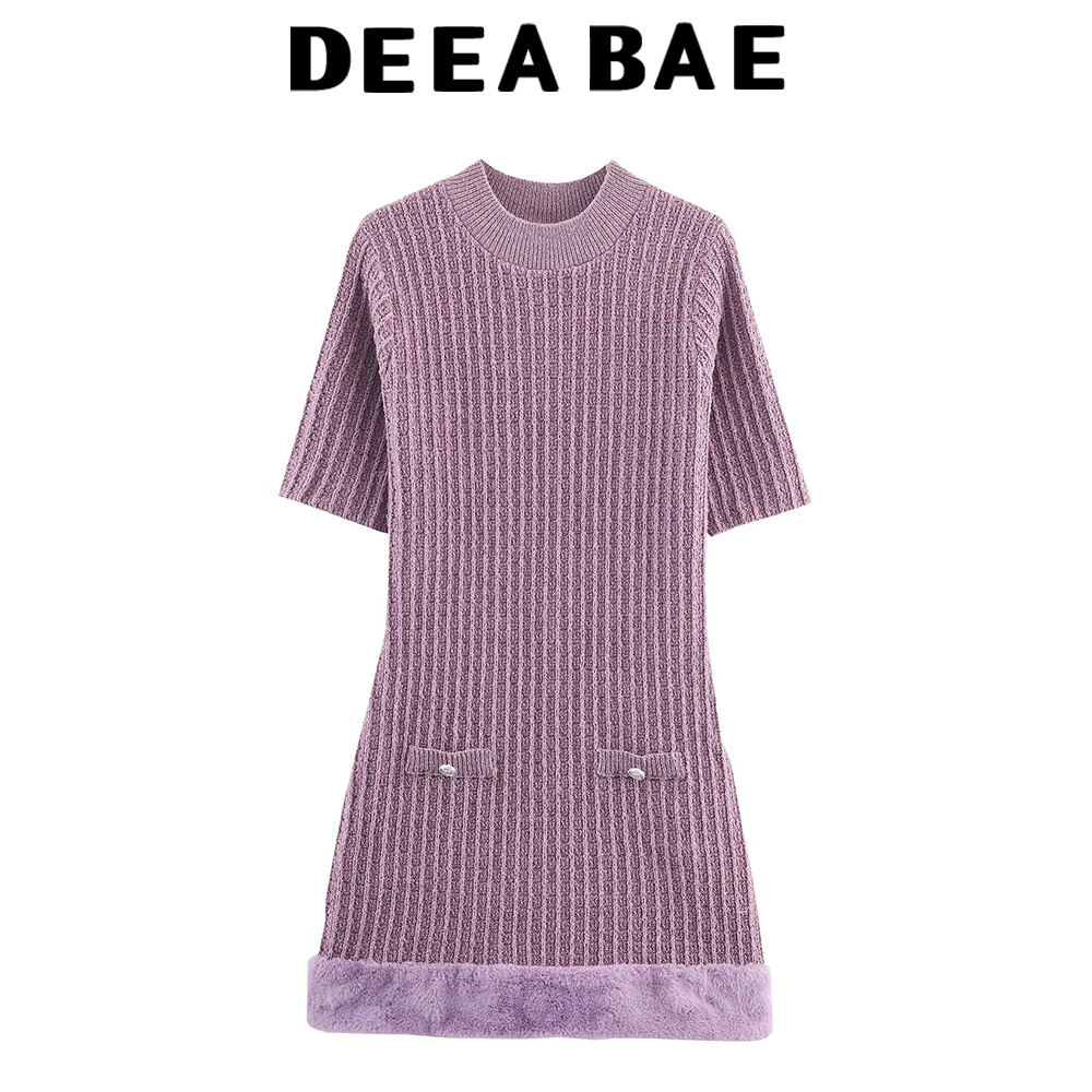 DEEABAE Autumn new women's clothing simple temperament French round neck short sleeved faux fur effect structural dress