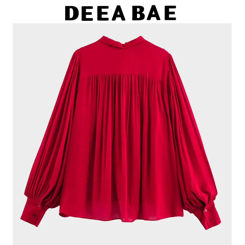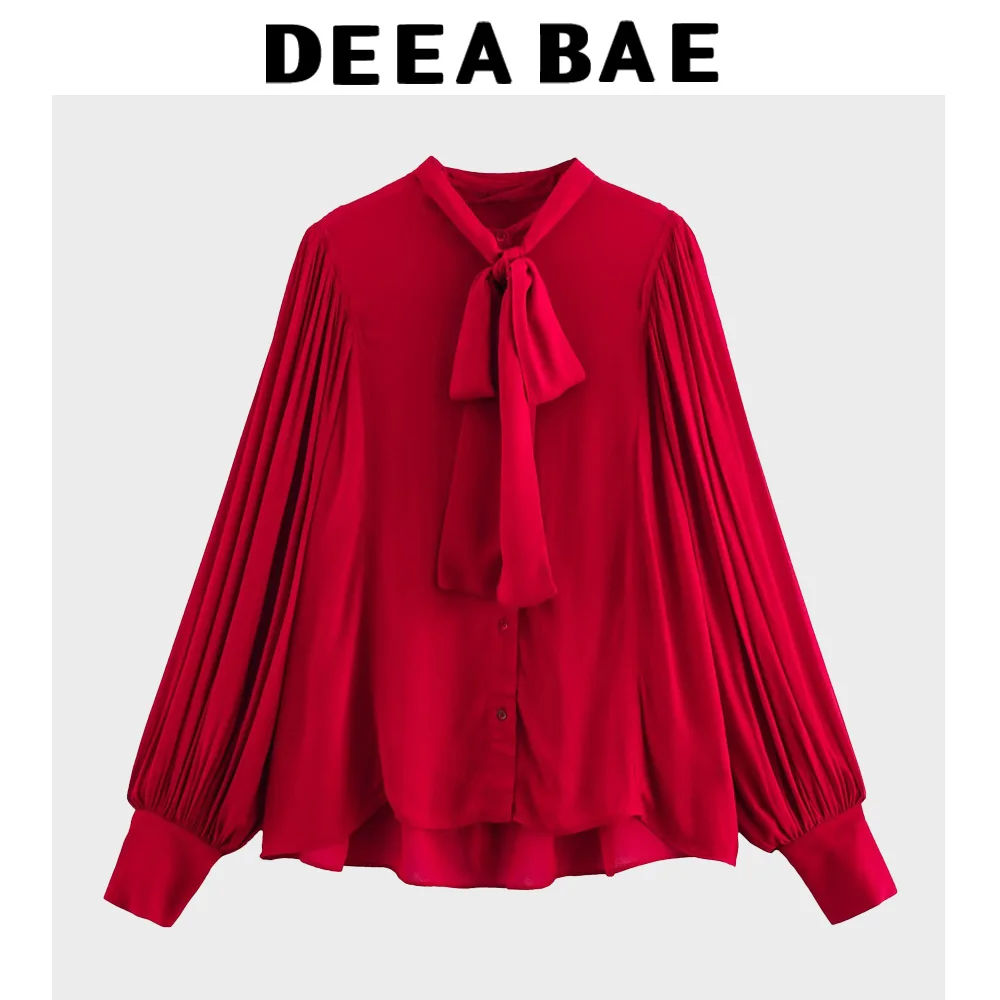 DEEABAE Bow Ribbon Red Chiffon Shirt Women's Early Spring New French Style High-end Temperament Age-reducing Top