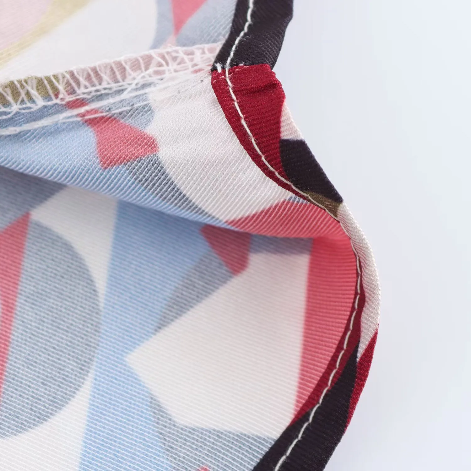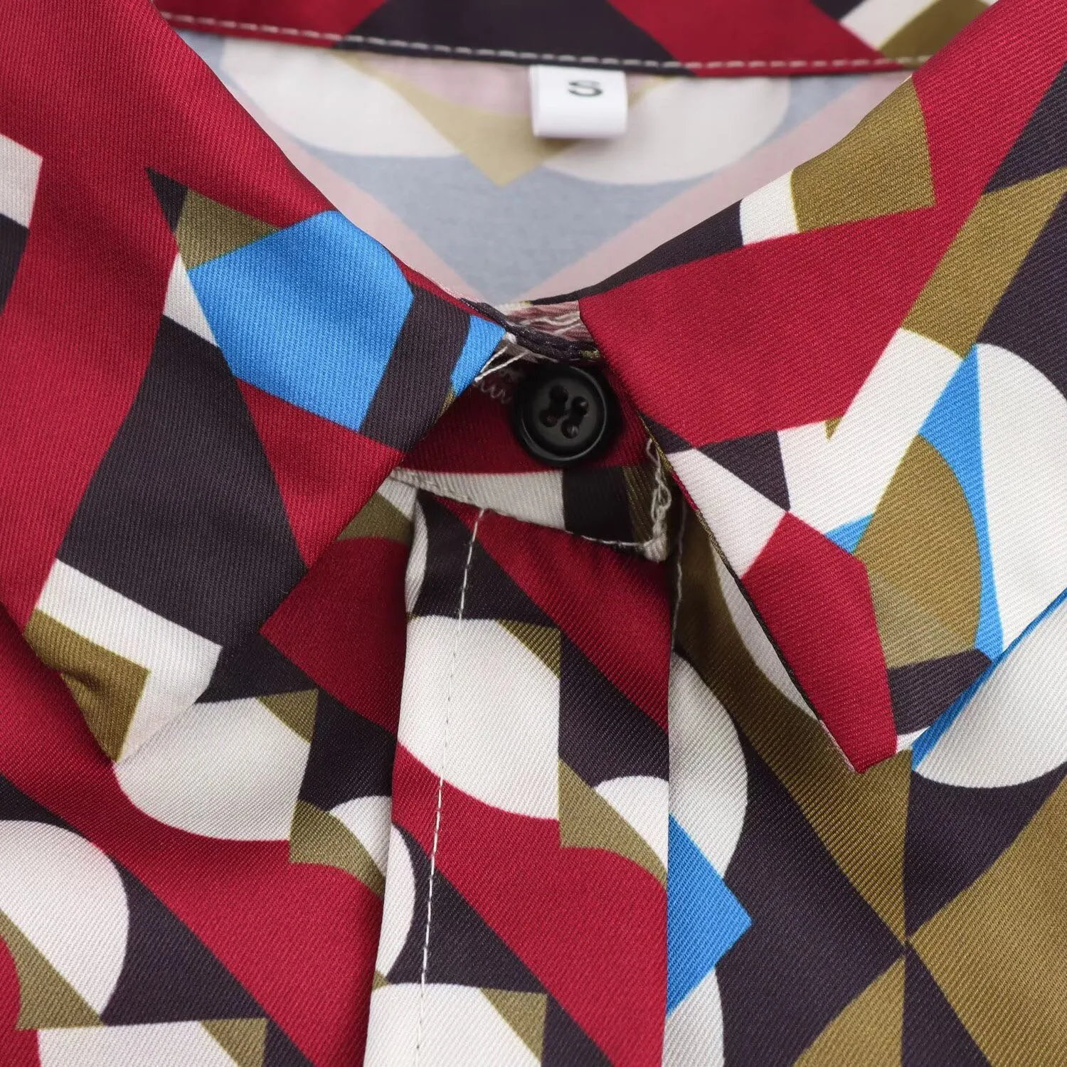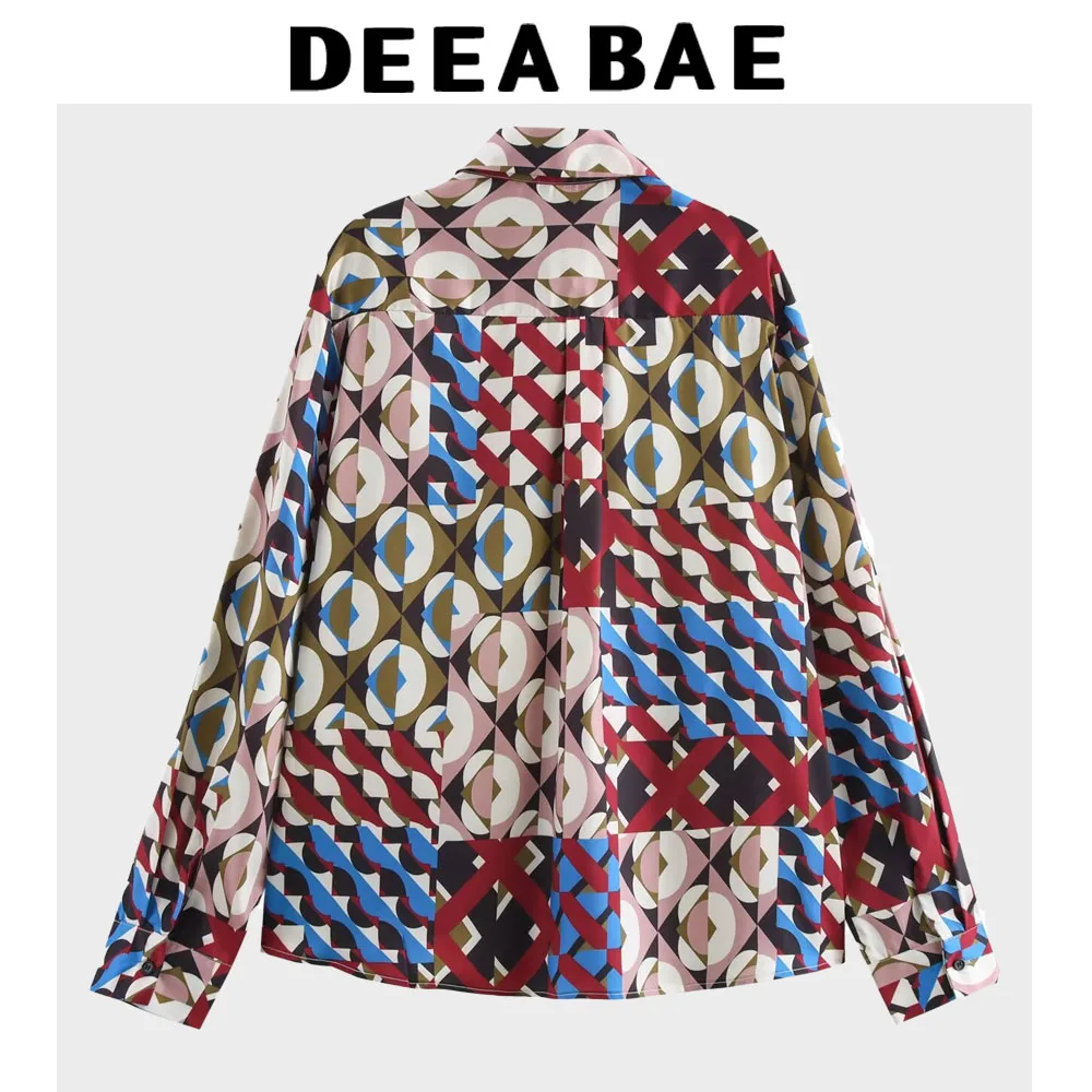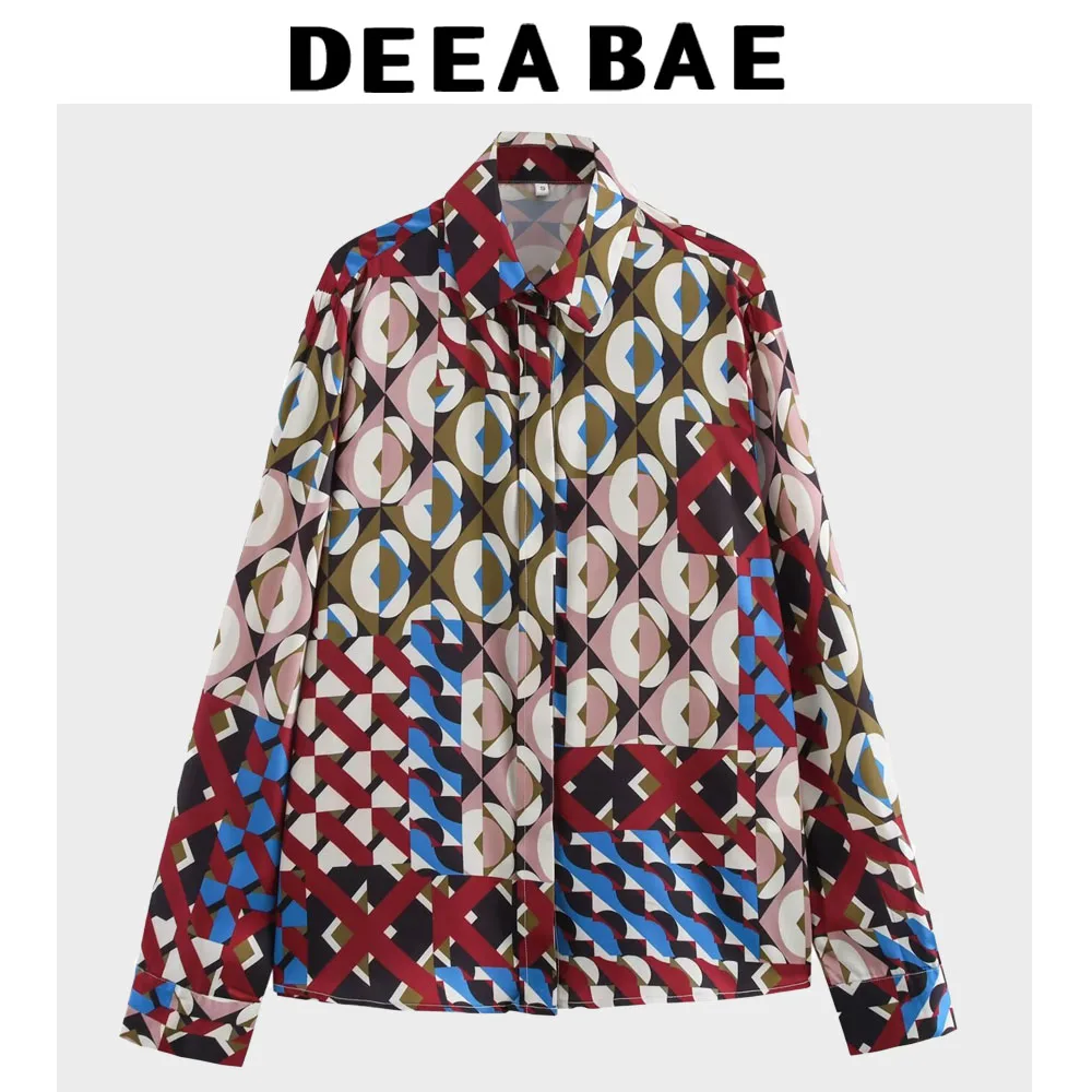 DEEABAE Elegant Polo Shirts Woman Loose Casual Lapel Long Sleeve Satin Texture Geometric Pattern Print Shirt