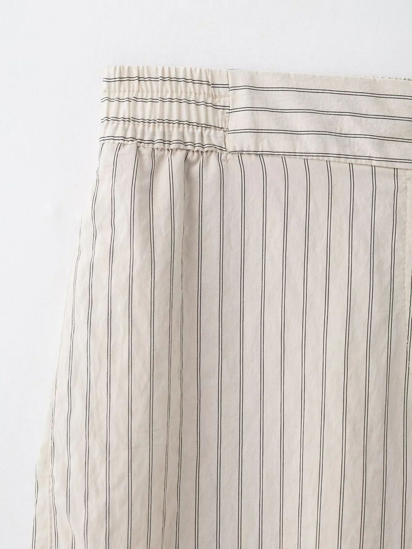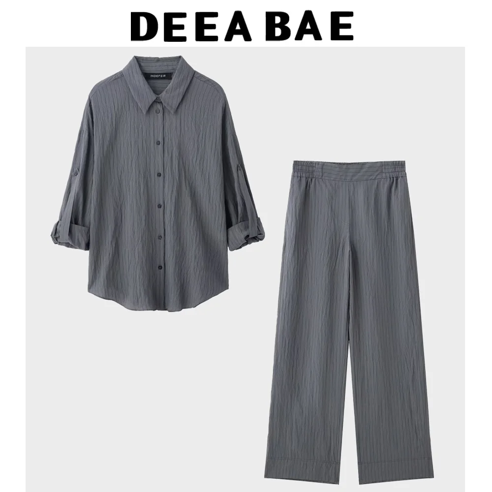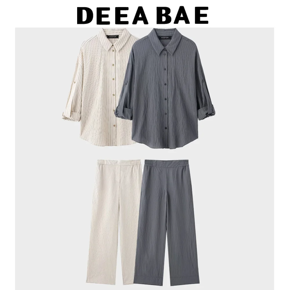 DEEABAE Elegant White Striped Wrinkle Decoration Casual Loose Long Sleeved Shirt With Lapel High Waist Striped Wide Leg Pants