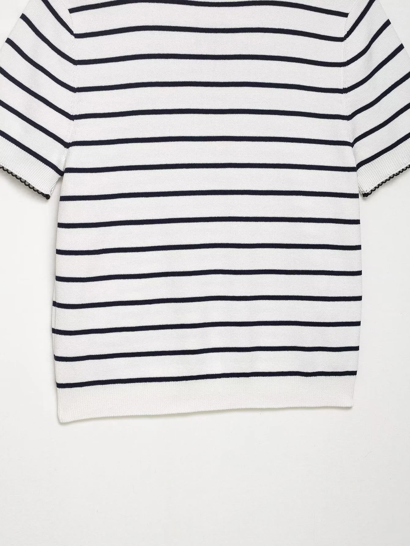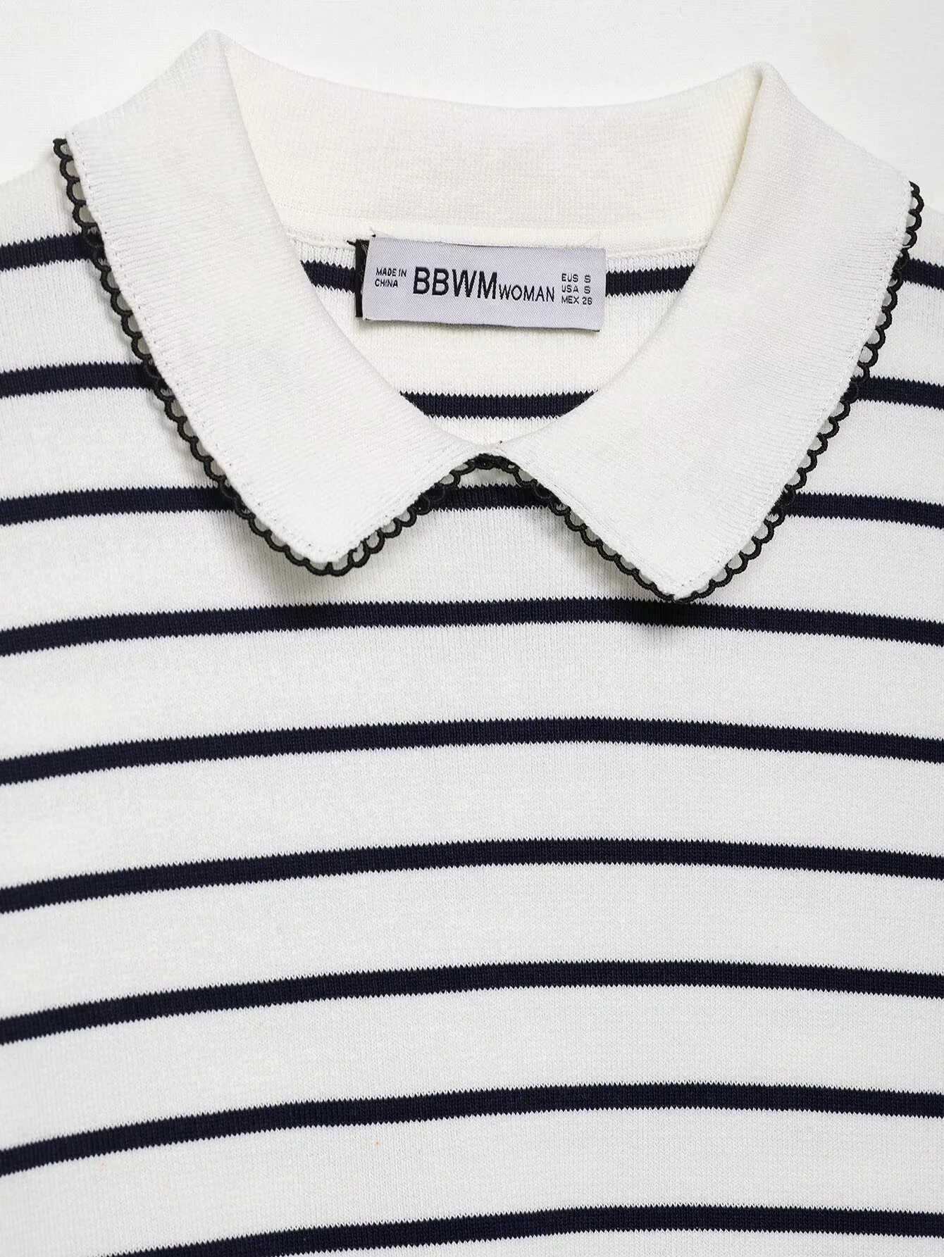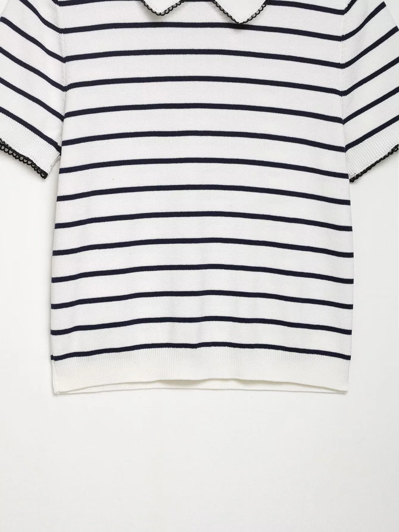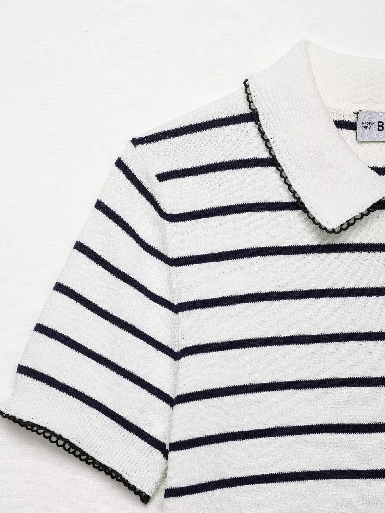 DEEABAE French college style black and white striped short sleeved T-shirt, summer new style loose and slimming polo collar top