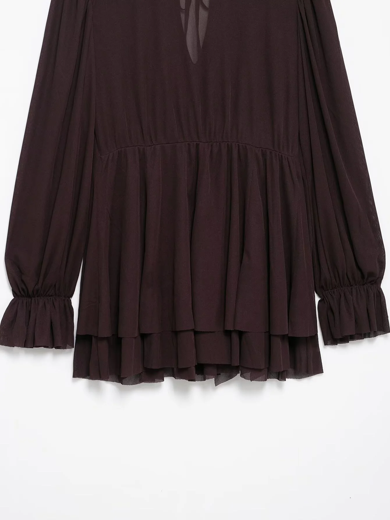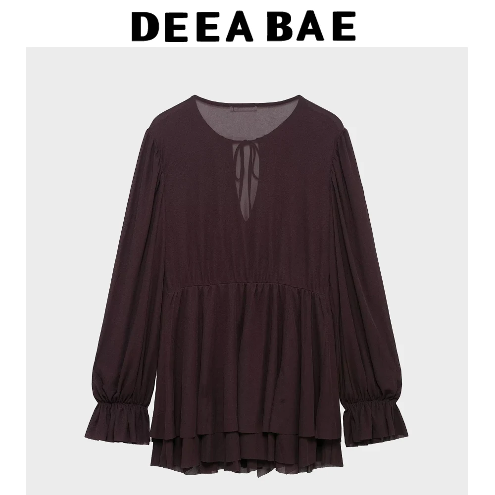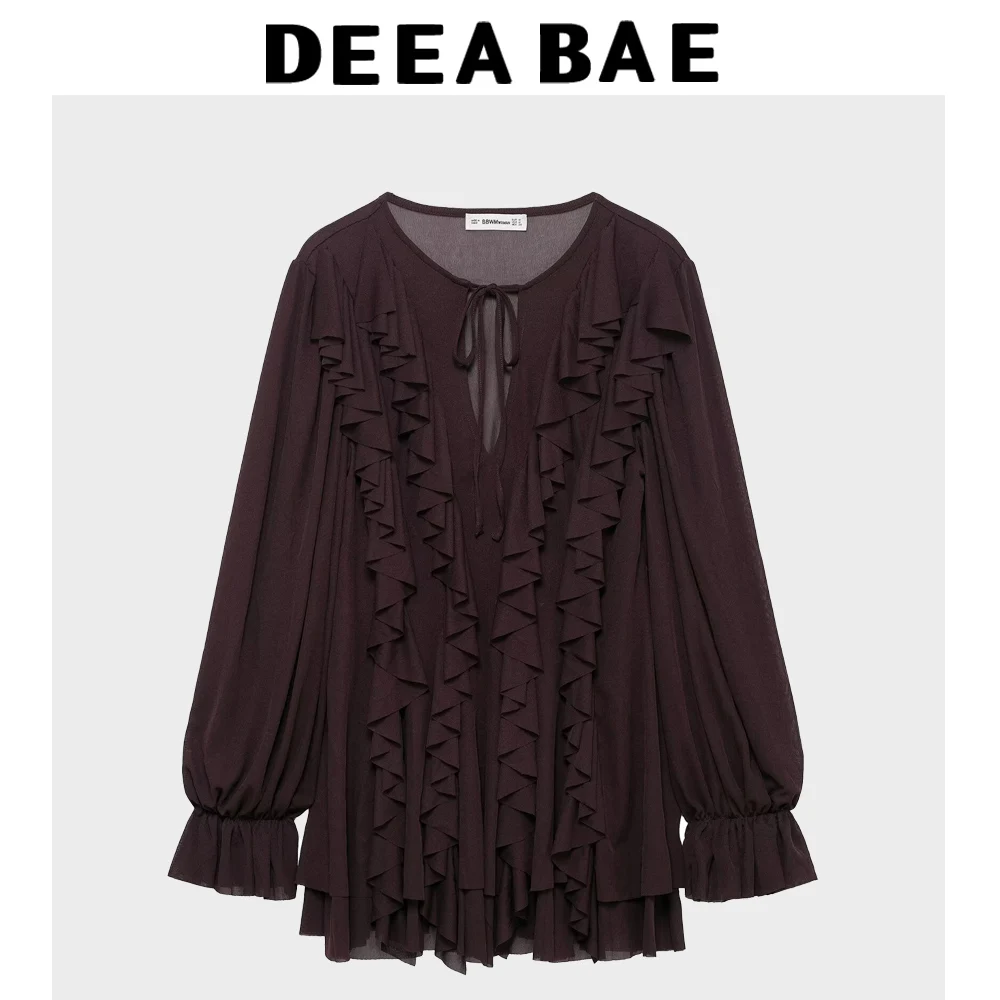 DEEABAE French Retro Brown Loose Bow Ruffle Edge Short Long Sleeved Knitted Dress For Women In Spring And Summer