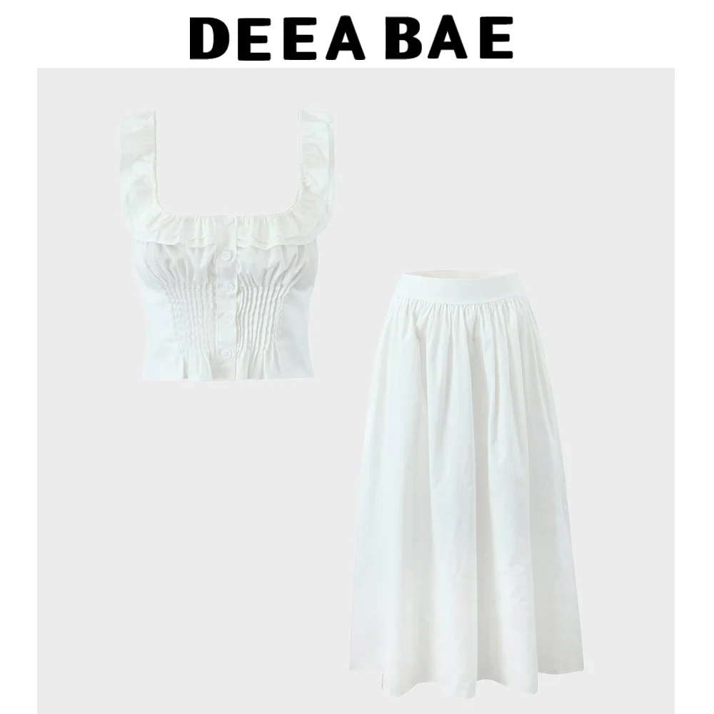 DEEABAE French Retro Yellow Highlighted White Ruffled Sleeveless Camisole Vest+high Waisted Skirt With Large Skirt