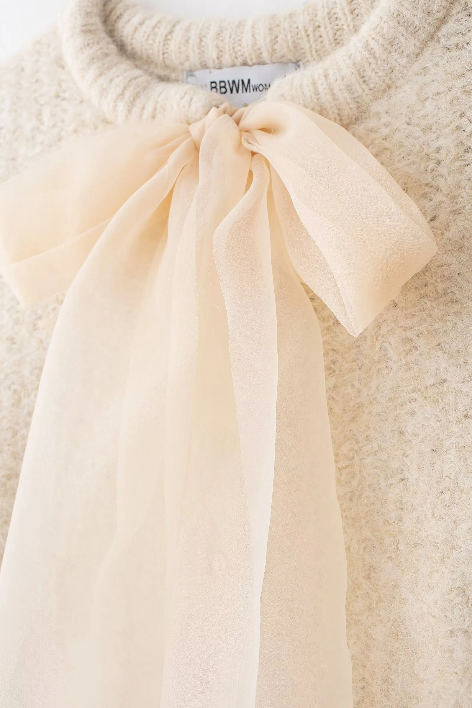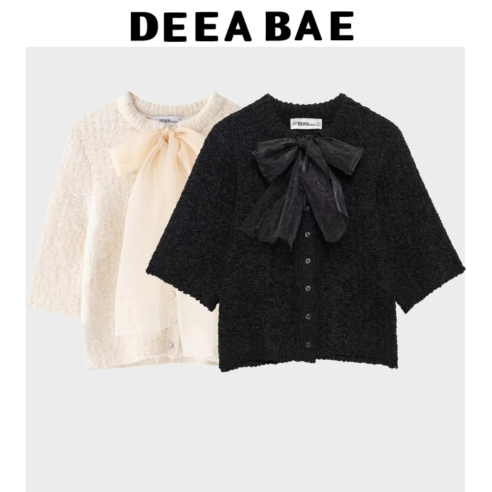 DEEABAE Korean Style Women’s Clothing Sweet Transparent Soft Yarn Bow Short-sleeved Sweater Casual All-match Knitwear Cardigan