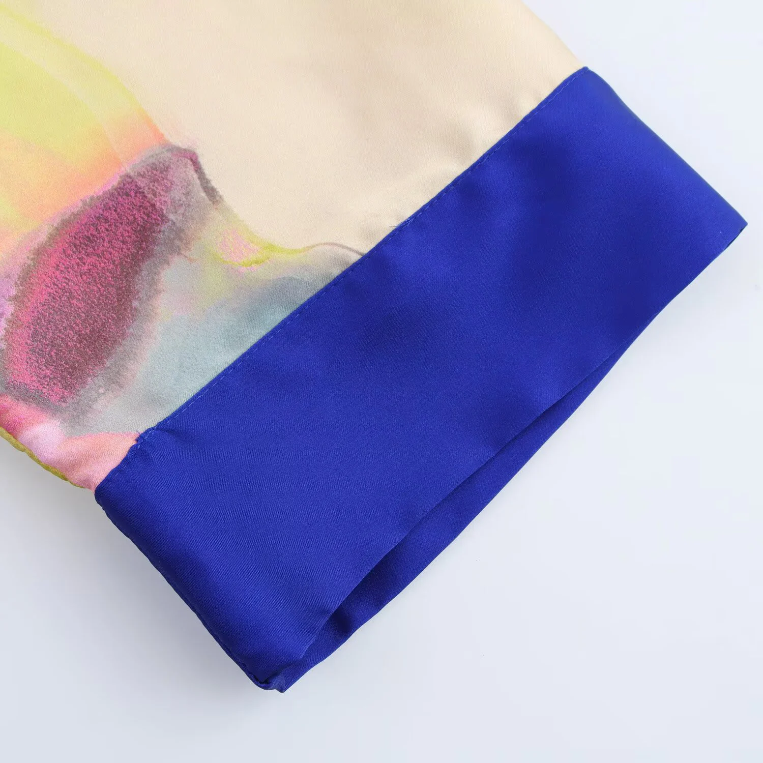 DEEABAE Korean Version Of New Women’s Clothing Retro Contrasting Printed Silk Satin Texture Shirt Single Breasted Top
