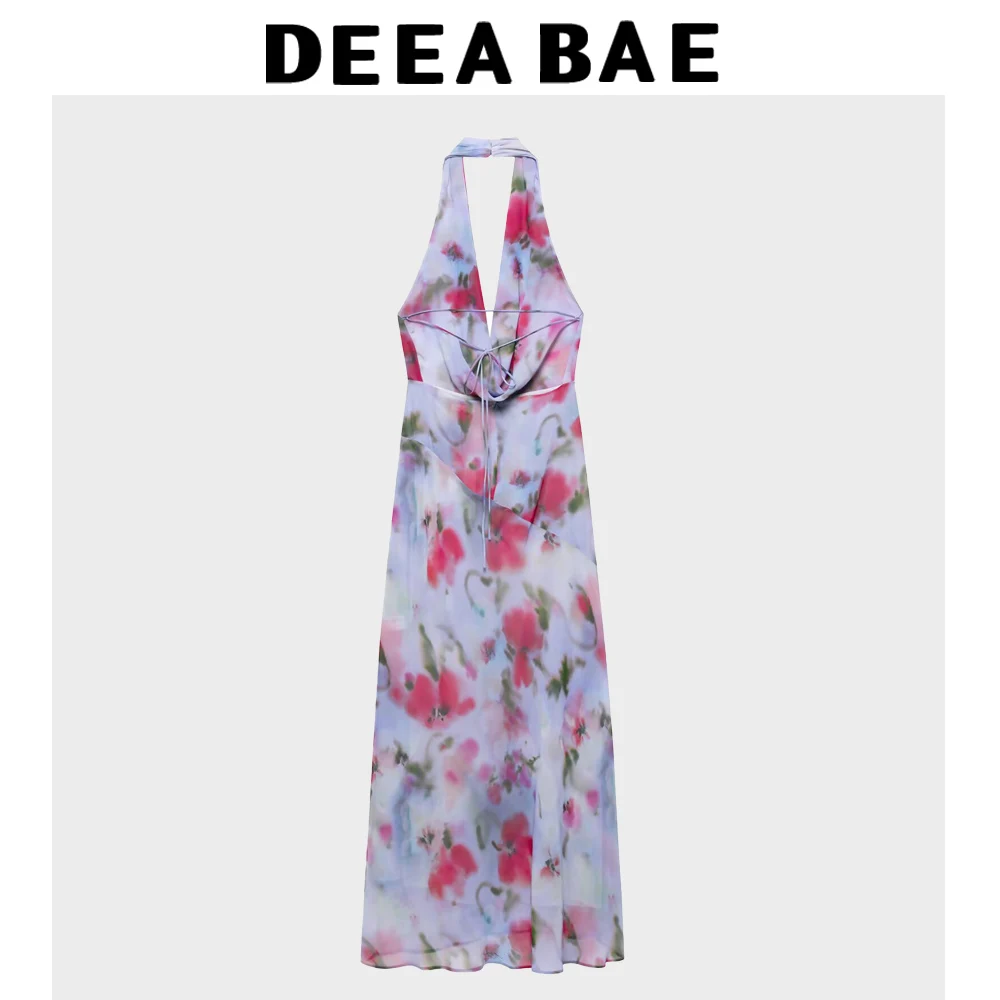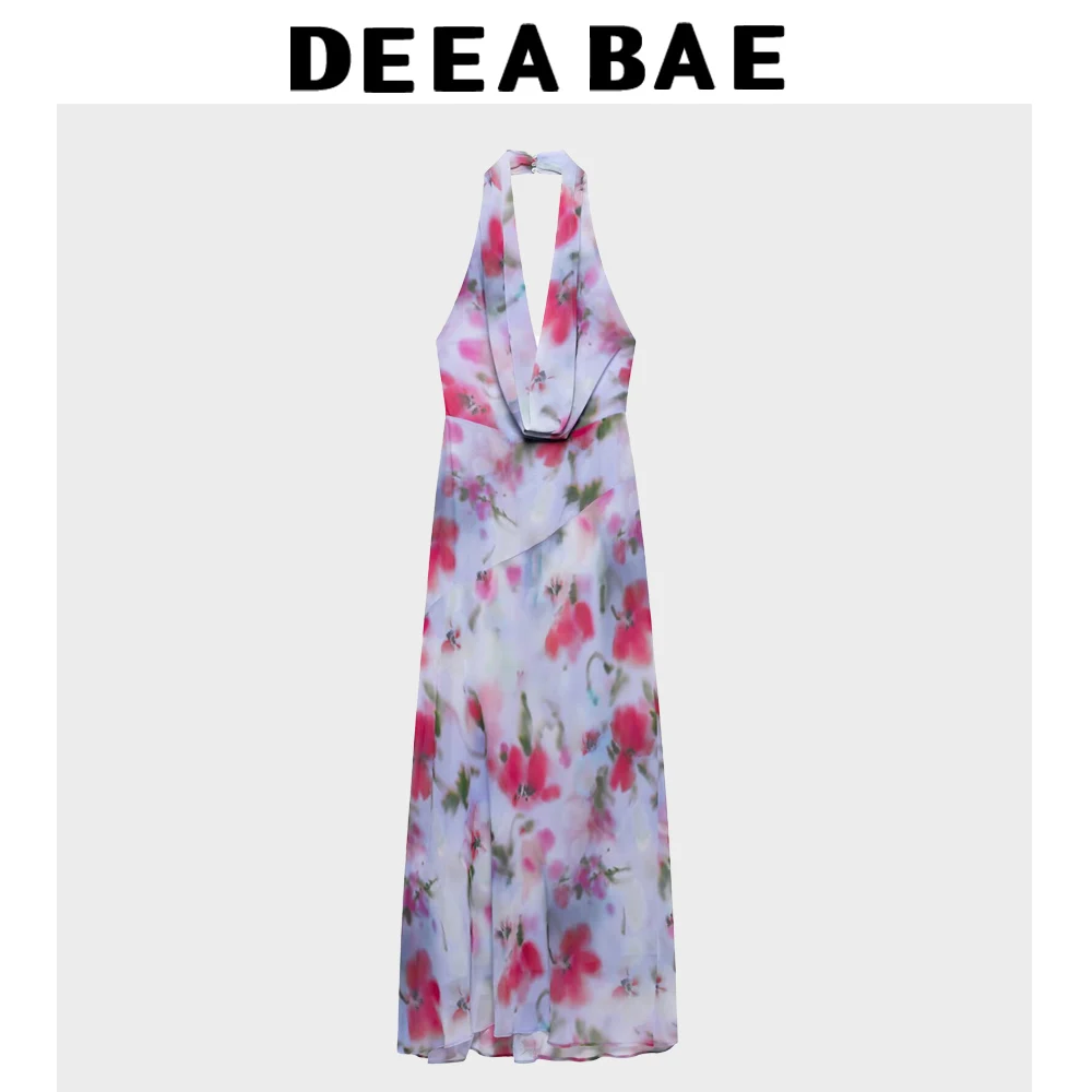 DEEABAE Korean Version Summer New Women’s Vacation Style Slim Fit Temperament Printed Hanging Neck Collar MIDI Dress