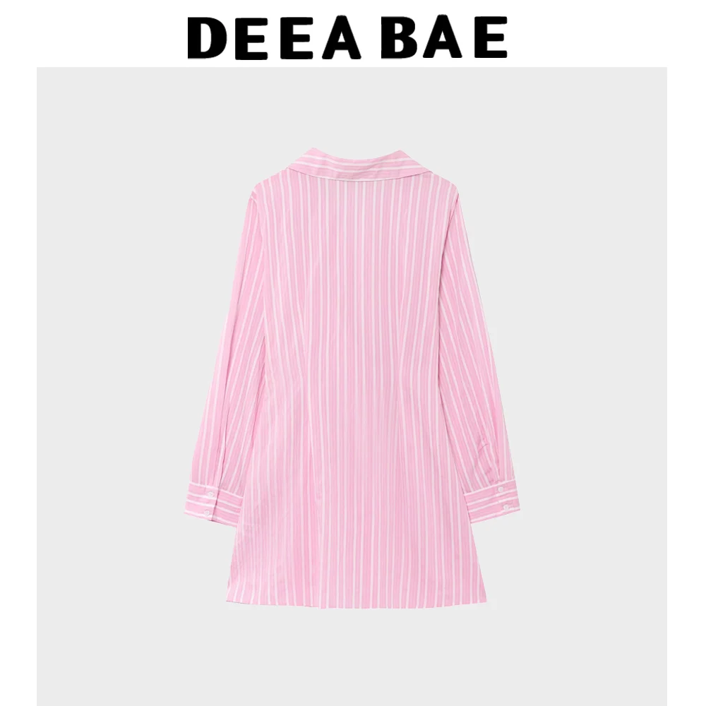 DEEABAE Korean Women’s Summer New Fashion Style Versatile Pink Striped V-neck Long Sleeved Mini Dress