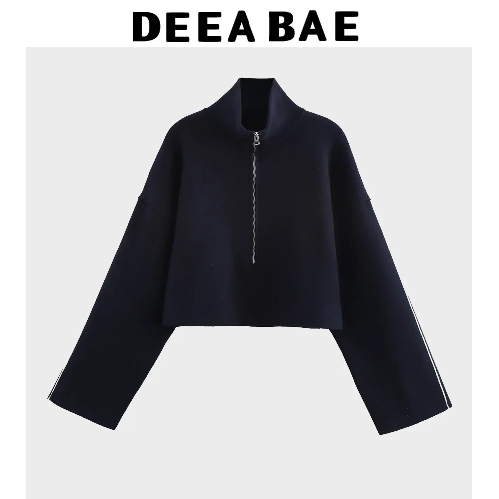 DEEABAE Luxury Brand Woman Clothing Zipper Trim Stand Collar Long Sleeves Sports Knitted Short Sweatshirt New knit