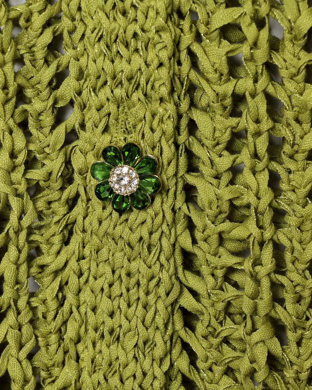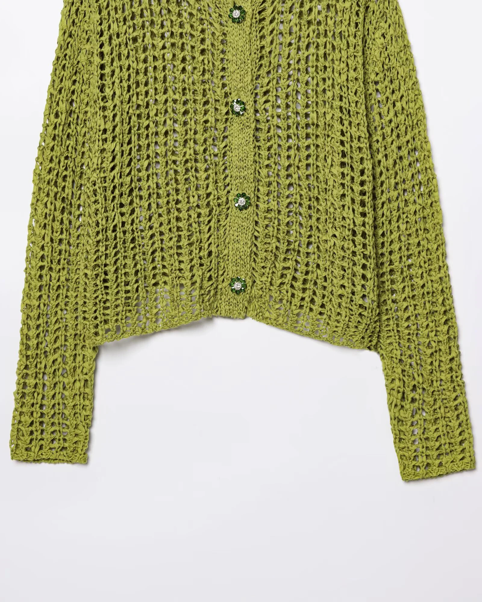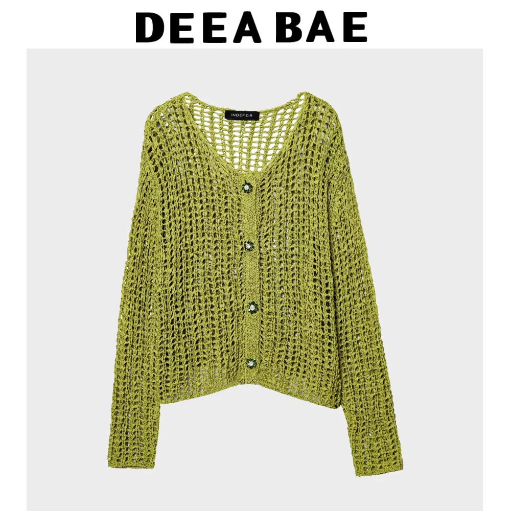 DEEABAE Mesh Embellished Jewelry Button Long Sleeved V-neck Green Knitted Cardigan Short Jacket For Women