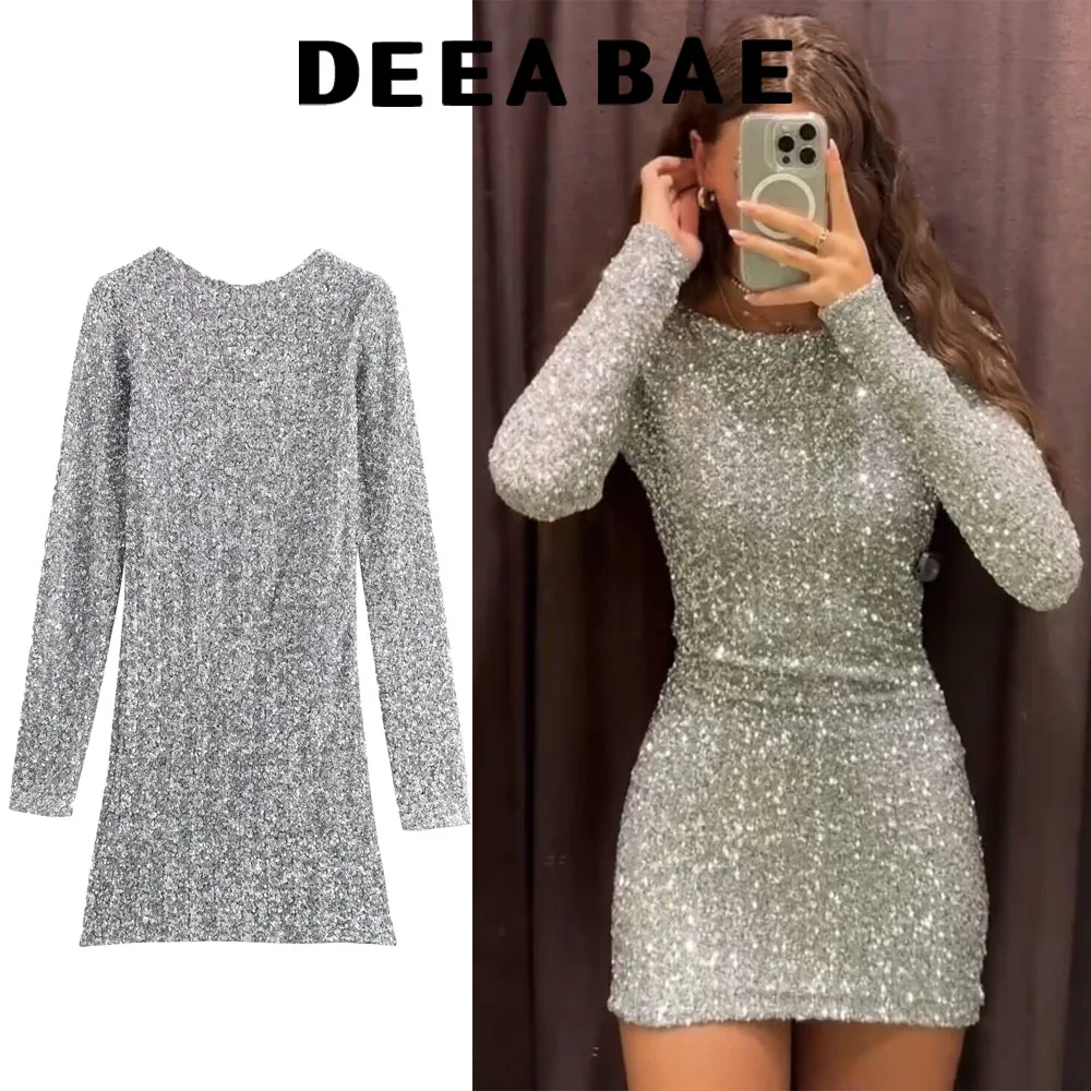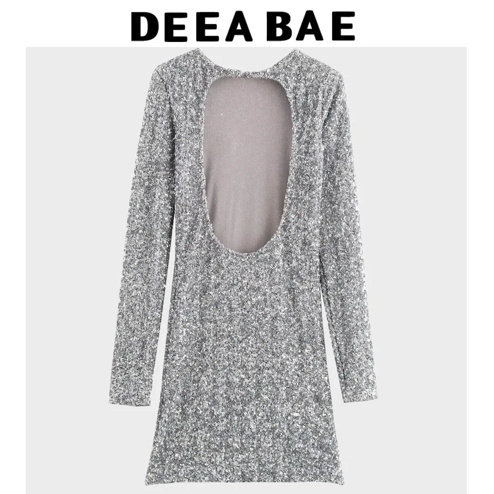 DEEABAE New Elegant Party Dresses Women Retro Slim Fit Long Sleeved Sequined Round Neck Sexy Backless Dress Short Skirt