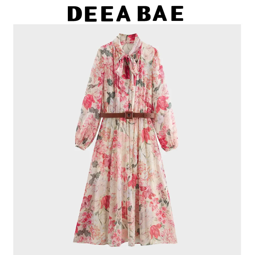 DEEABAE New French Platycodon Tea Break Floral Dress With Bow Tie To Reduce Age And Sweetness With Belt Flower Print Midi Dress