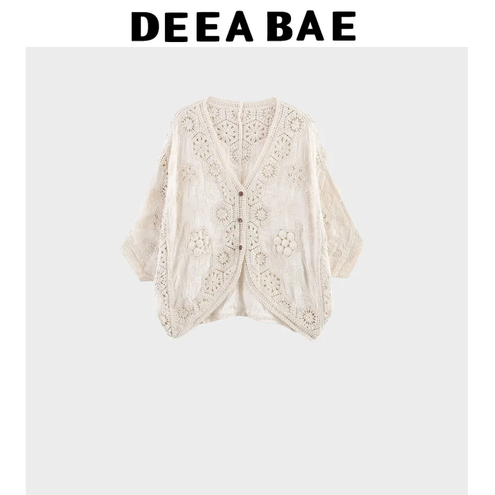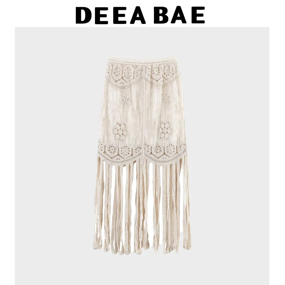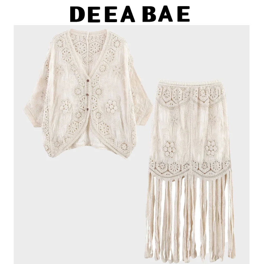 DEEABAE New Women's Fashion French Retro Hook Flower Hollow V-neck Knitted Cardigan Hollow Tassel Half Skirt Set