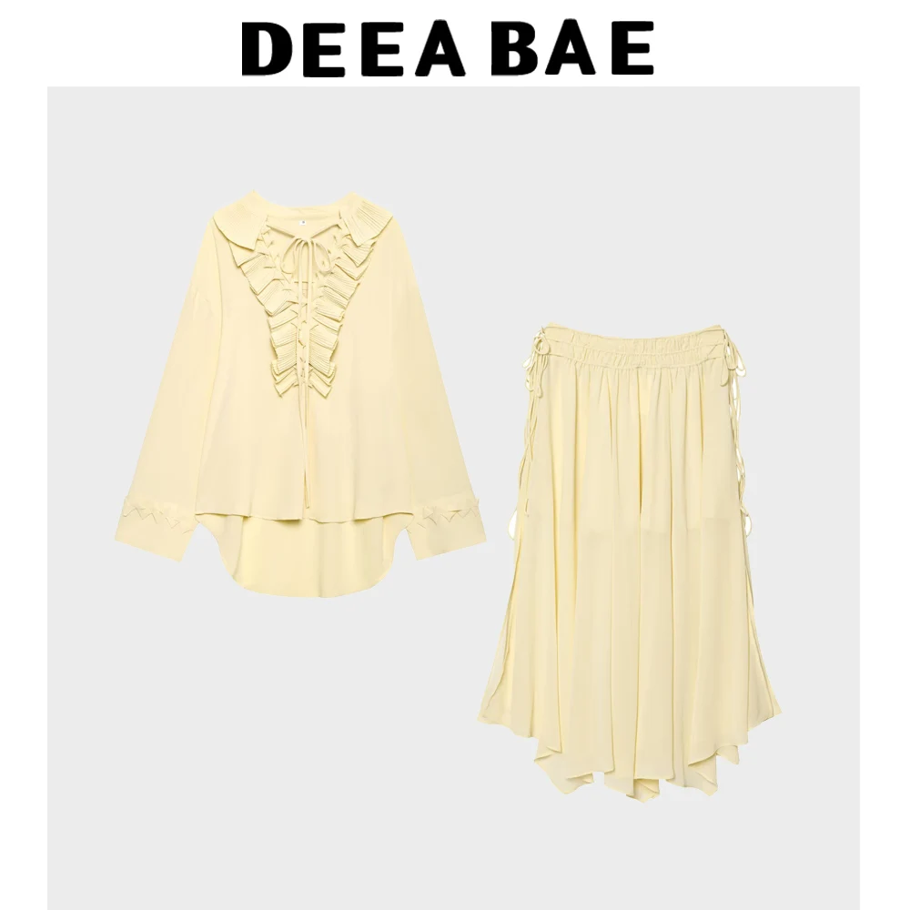 DEEABAE New Women's Spring/Summer Versatile Long Sleeve Loose V-neck Wave Style Dress Shirt High Waist Skirt Set