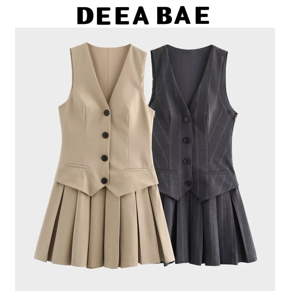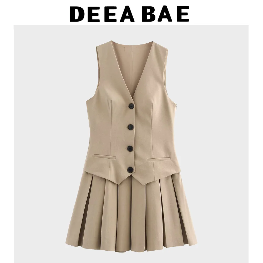 DEEABAE New Year's New Temperament Wide Pleated Vest Style V-neck Sleeveless Versatile Short Dress Pleated Skirt