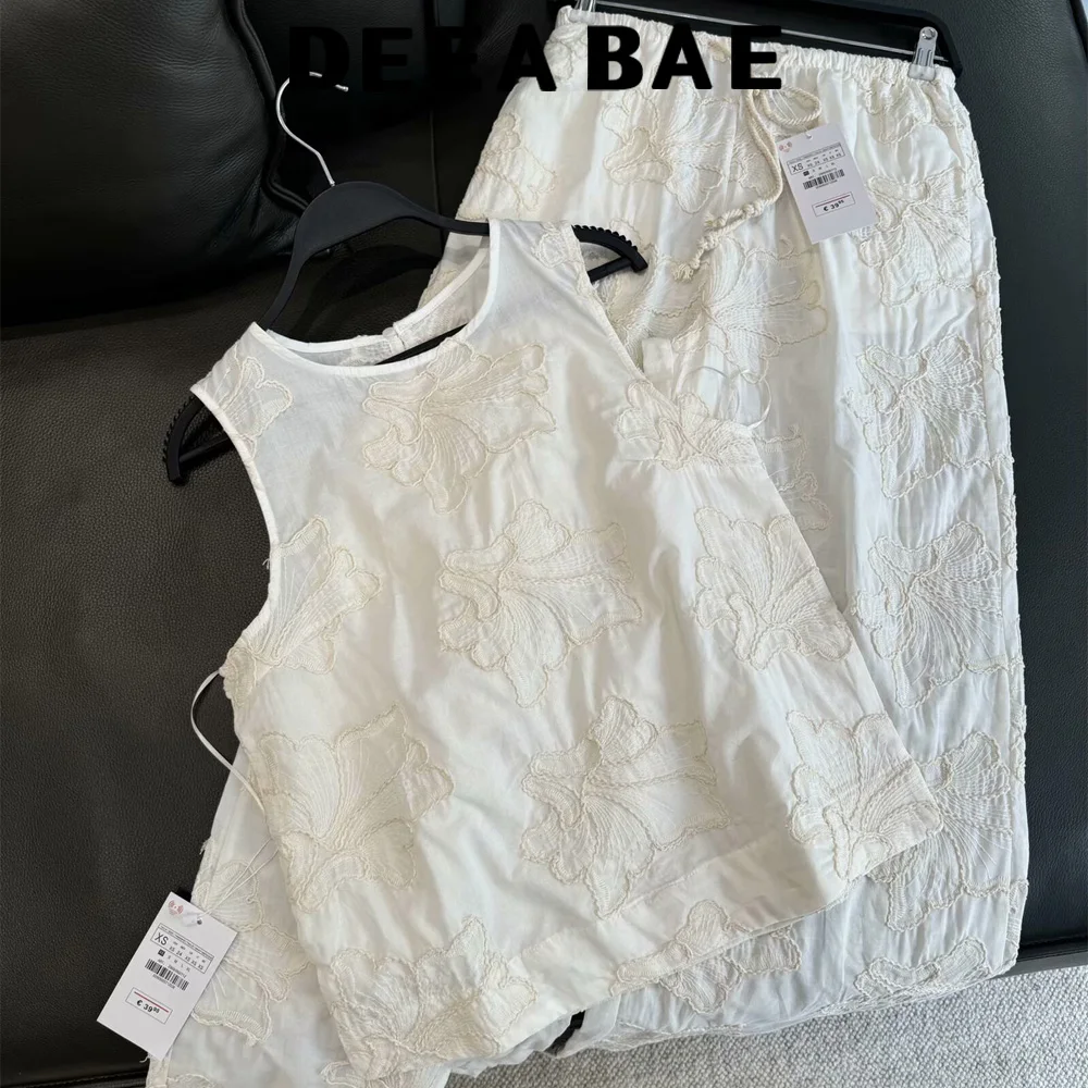 DEEABAE Round neck vest top with heavy-duty three-dimensional weaving crochet embroidery elastic waist wide leg pants set