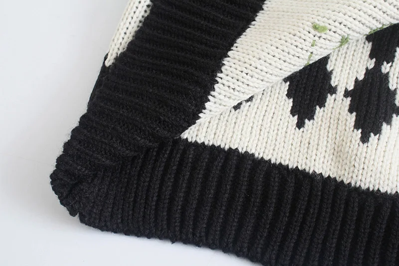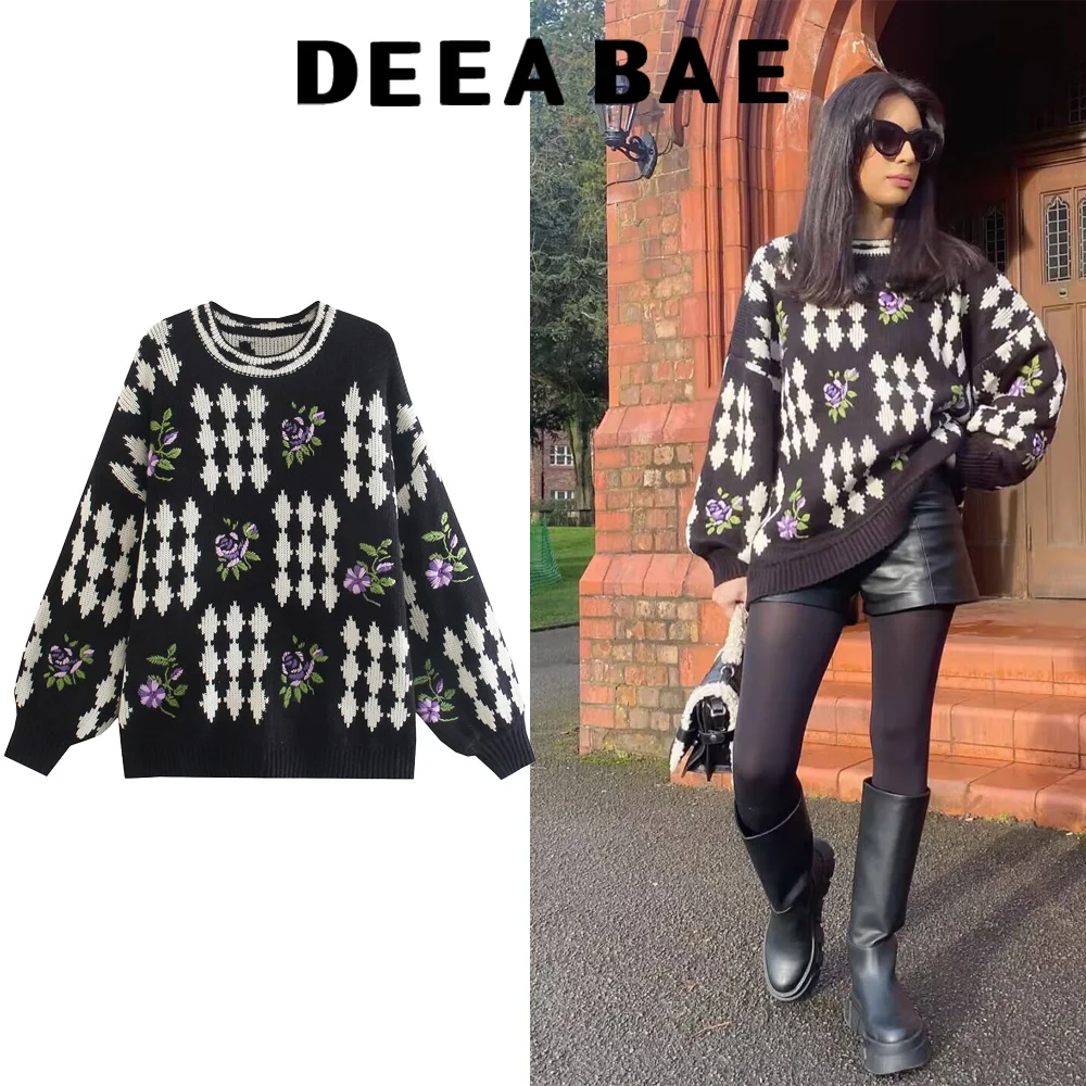 DEEABAE Spring Contrast Color Round Neck Long Sleeve Knitted Sweater Jacquard Soft And Loose Pullover Sweater