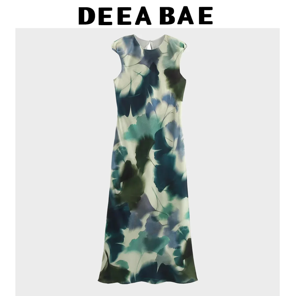 DEEABAE Spring Fashion Temperament Satin Texture Print Sleeveless Round Neck Midi Dress Elegant Womens Party Dresses