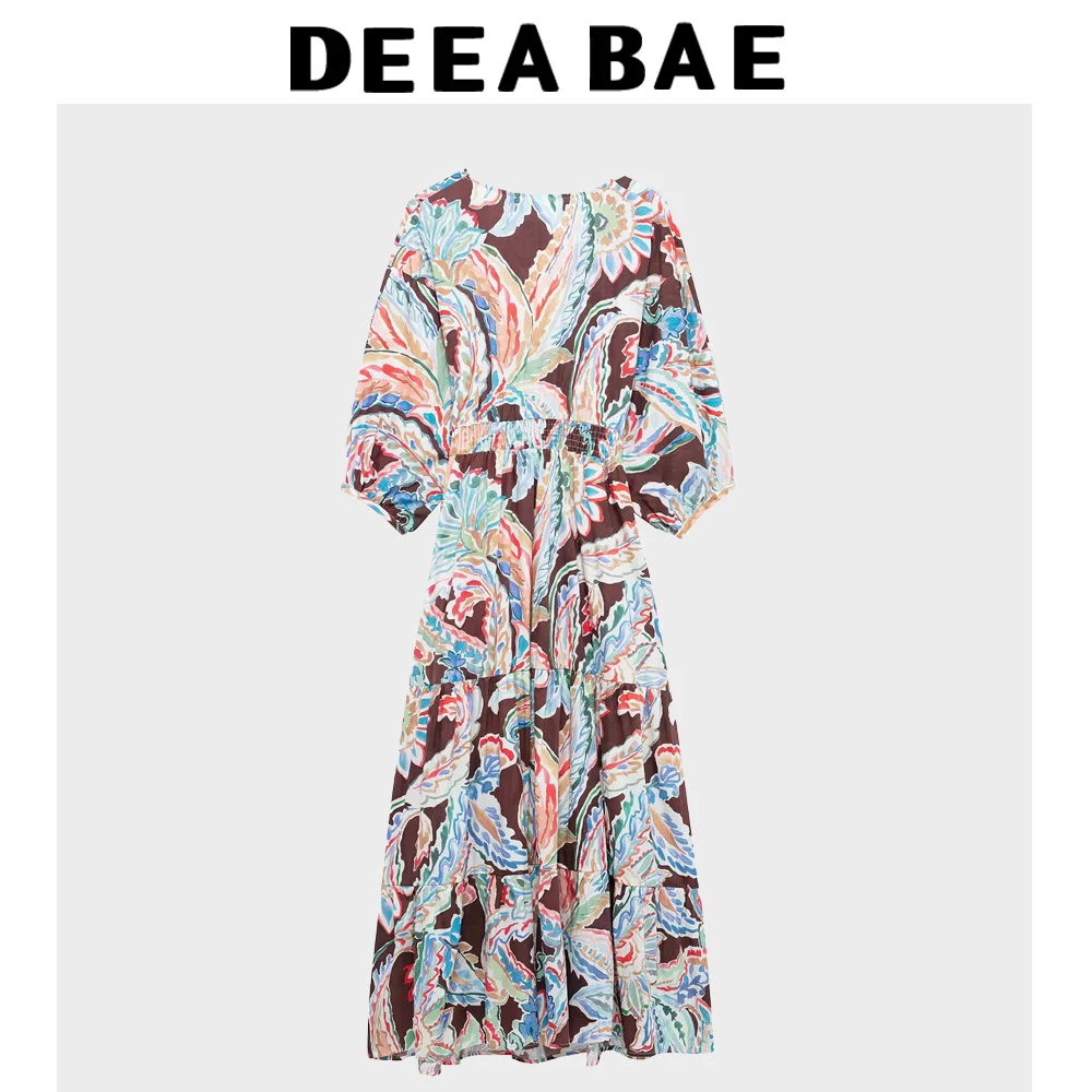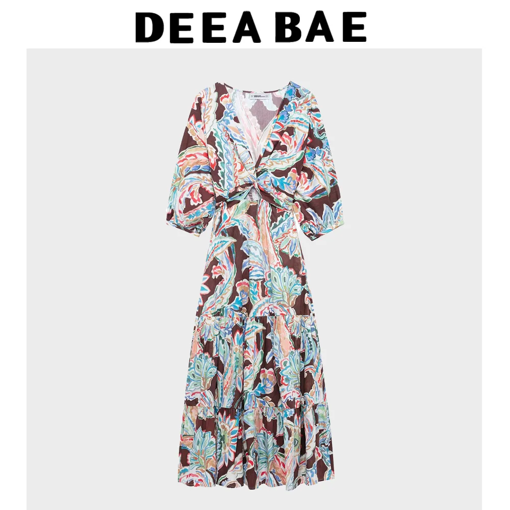DEEABAE Spring New Women's Clothing Knot Decoration Printed Poplin Long Sleeve V-neck Slimming Long Dress Midi Dress