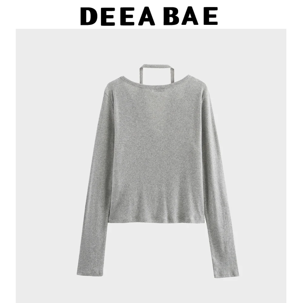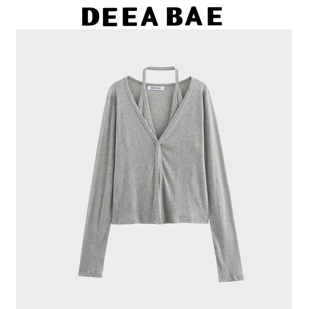 DEEABAE Spring New Women's Clothing Sweet And Fashionable Fake Two Piece V-neck Long Sleeved Hanging Neck Knitted Cardigan Top