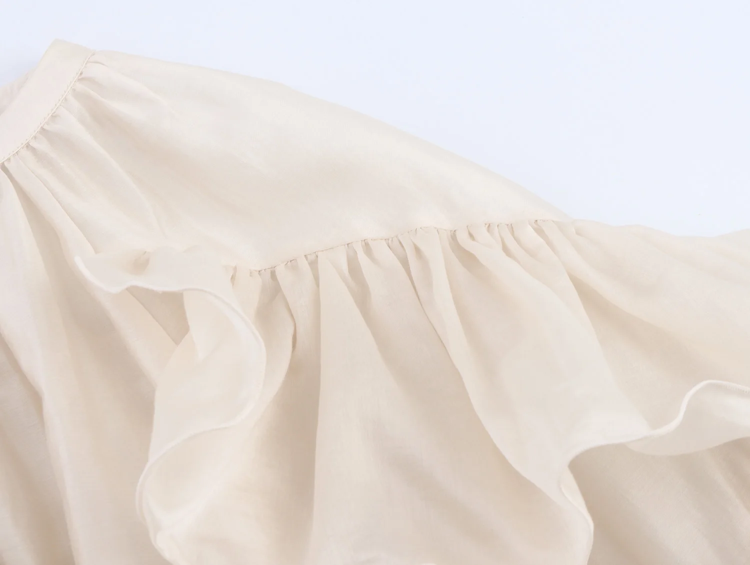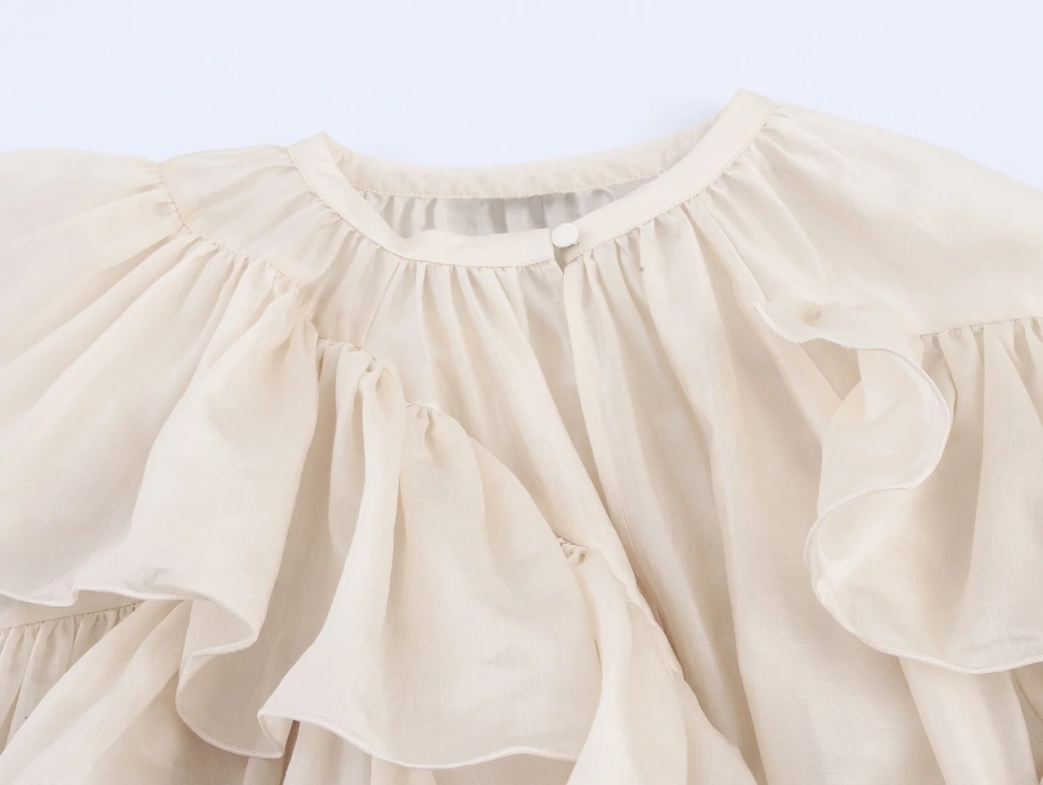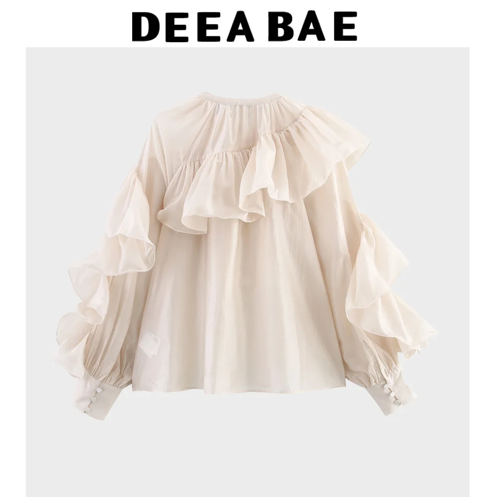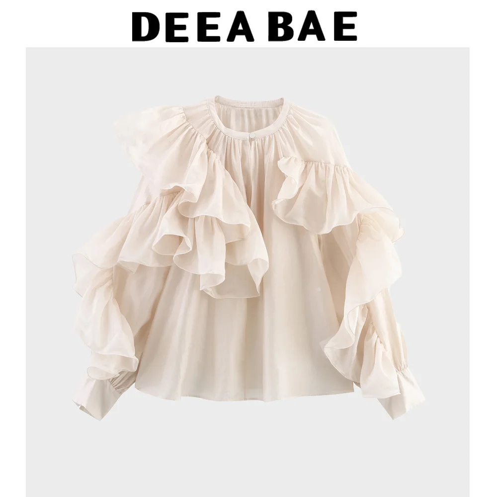 DEEABAE Summer French Chiffon Ruffle Edge Layered Decoration Fashionable Round Neck Long Sleeved Shirt Top For Women