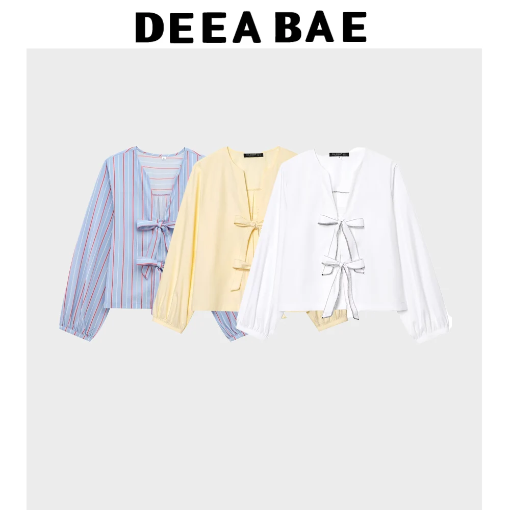 DEEABAE Summer New Fashionable Style Bow Decoration Poplin Sweet Girl Yellow Highlighted White V-neck Shirt