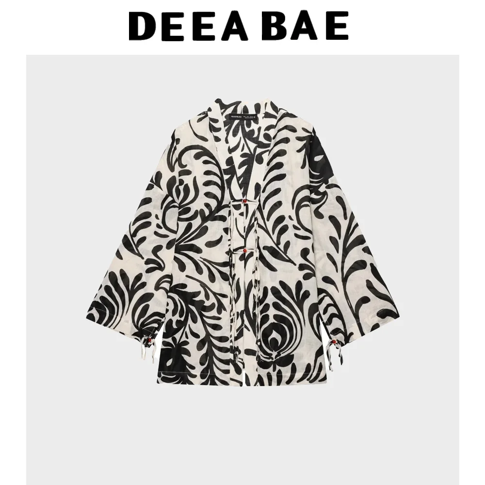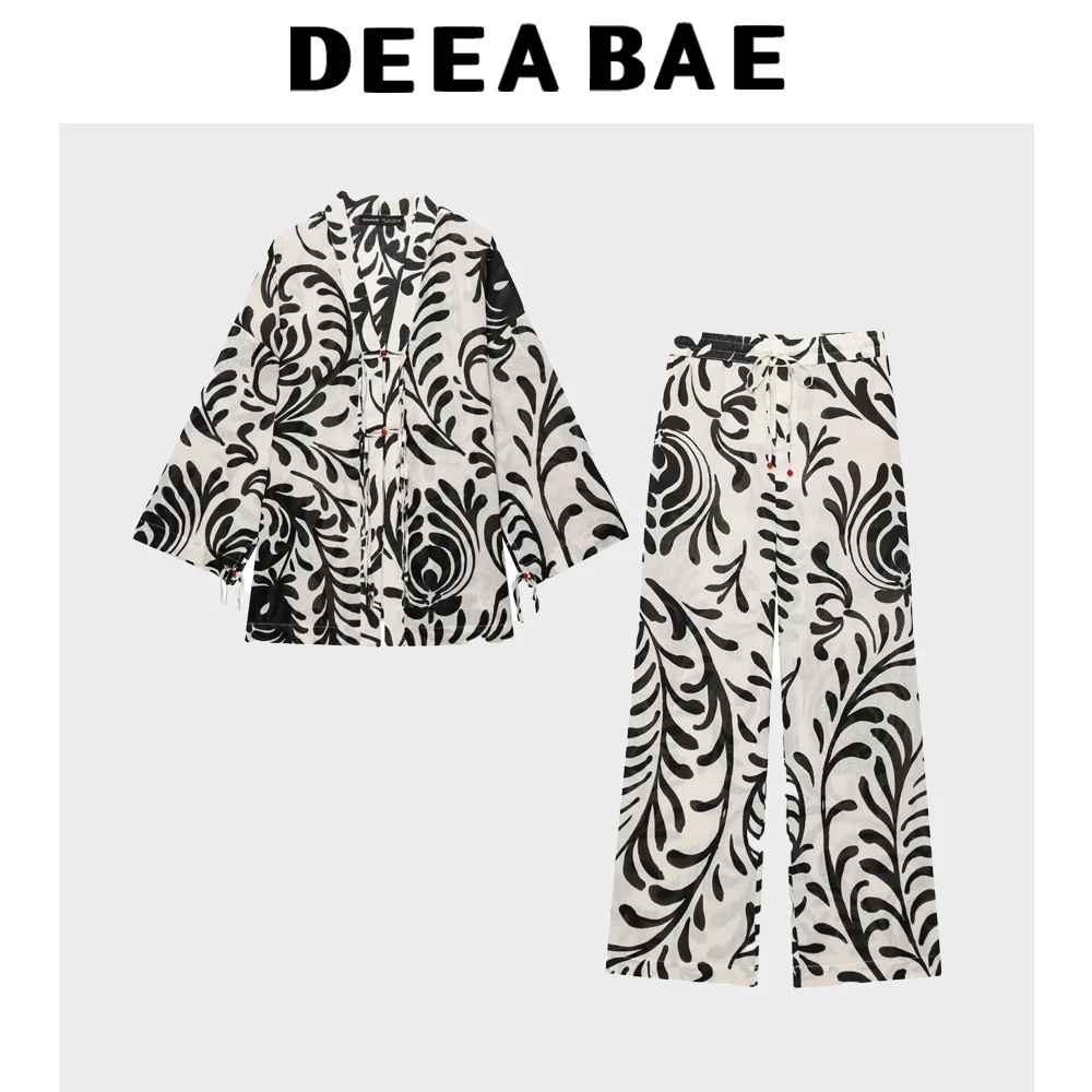 DEEABAE Summer new fashionable temperament printed long sleeved lapel coat mid waist straight leg casual pants set