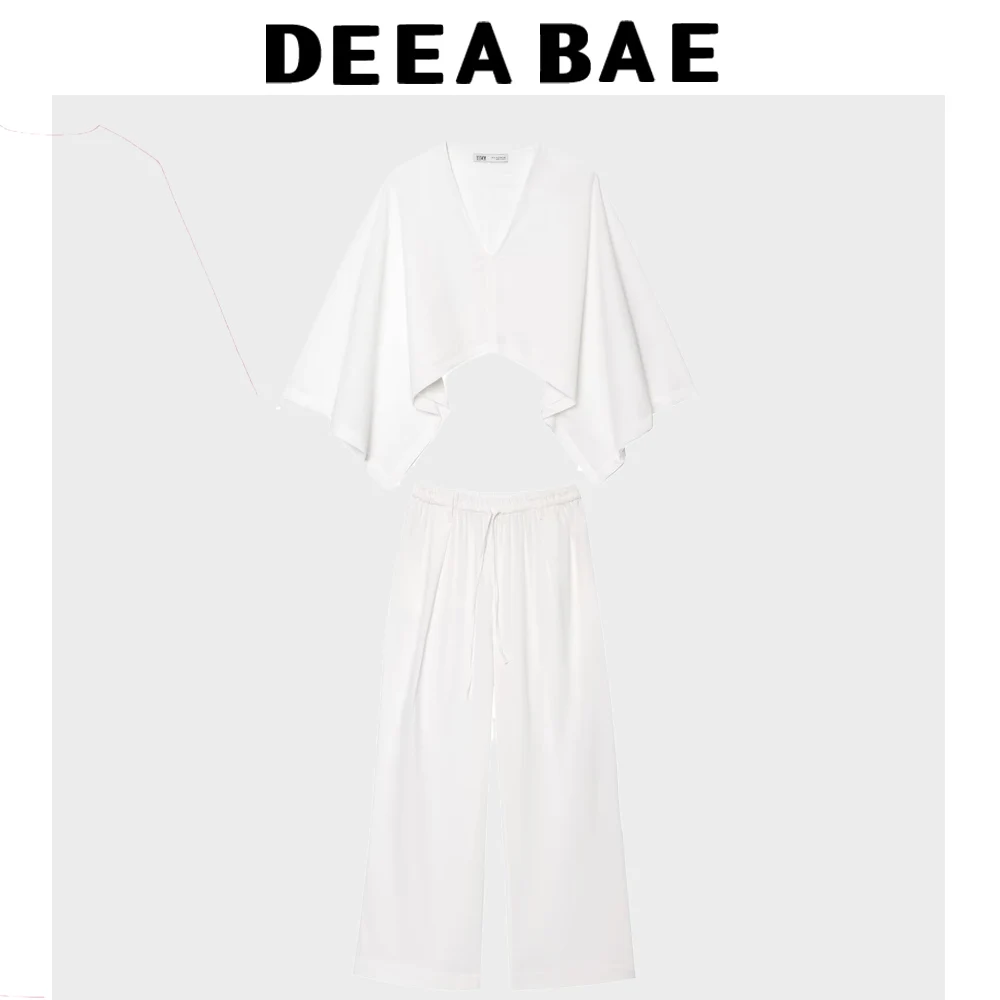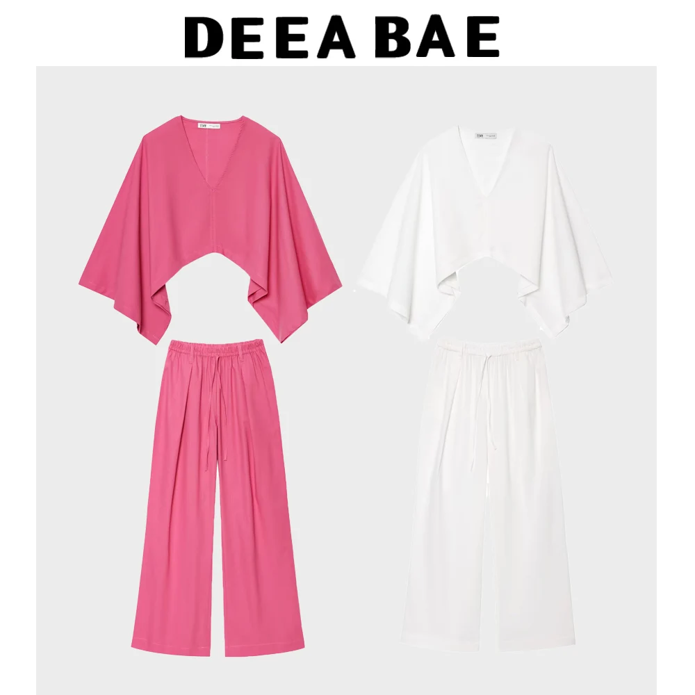 DEEABAE Summer New Product Women's Vacation Lazy Waist Blended Cape Wide Sleeve Long Sleeve Shirt Top Casual Pants Set