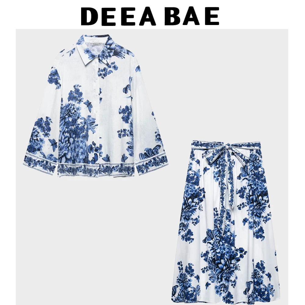 DEEABAE Summer New Style French lapel loose Print Relaxed Feeling Shirt High Waist Print Elegant Lace Up Design A-line Skirt