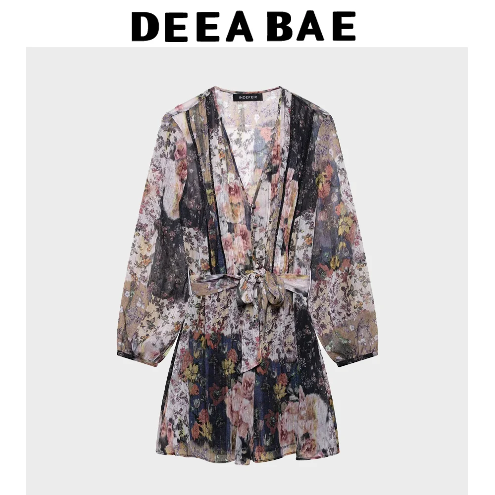 DEEABAE Summer New Women’s Clothing European And American Style Retro Fashion Print With Belt V-neck Mini Dress