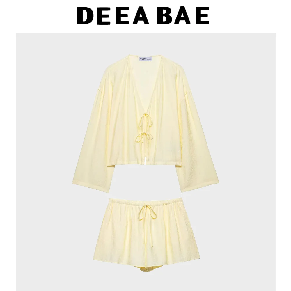DEEABAE Summer new women's clothing wrinkle effect hanging shoulder long sleeved outerwear casual shorts set