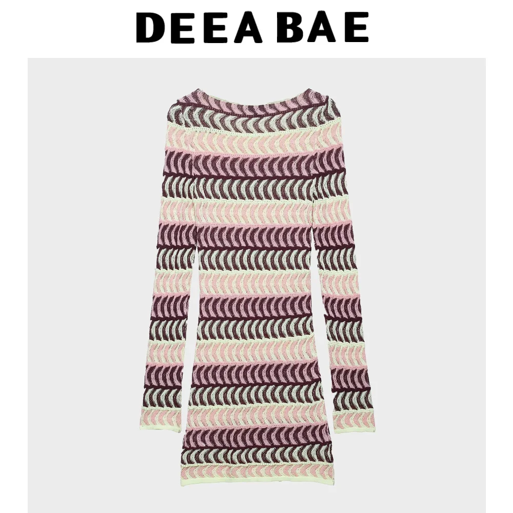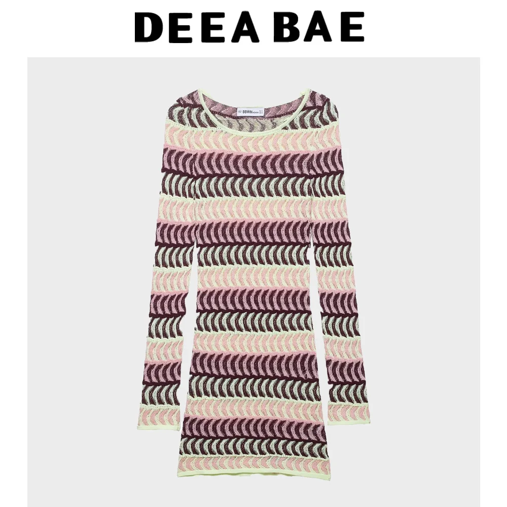 DEEABAE Summer New Women’s Fashion Simple Temperament Texture Printed Round Neck Long Sleeve Knitted Dress