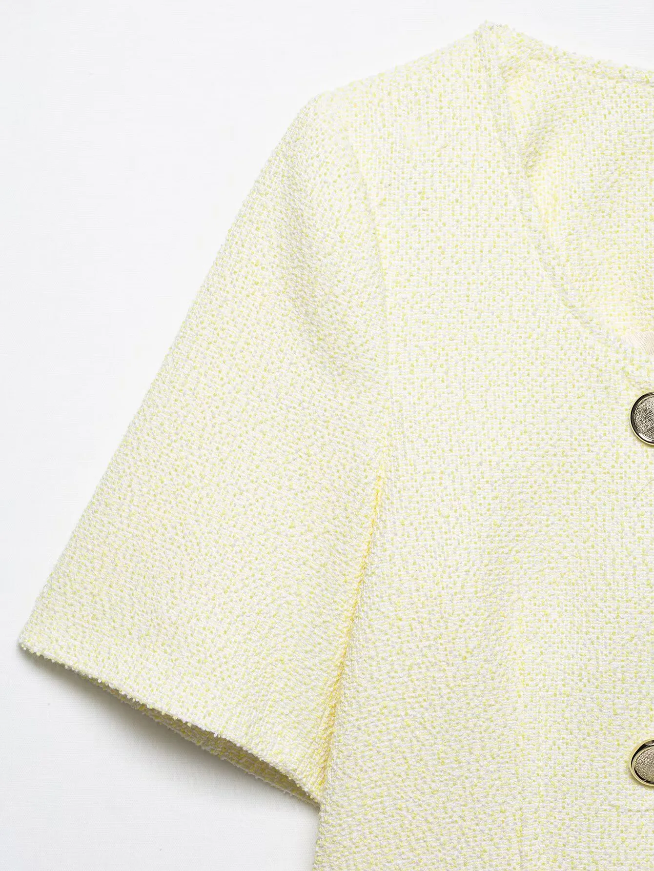 DEEABAE Summer New Women’s Textured Short Sleeved Round Neck Casual Suit Jacket With Gold Buckle Design Casual Shorts Set