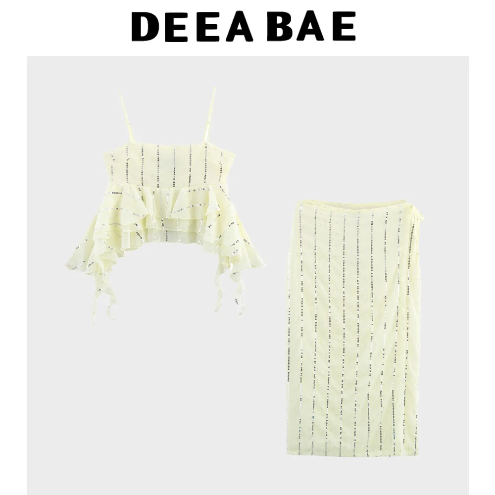 DEEABAE Summer women's clothing new fashion temperament layered decorative bead top, yarn cage mid length skirt set