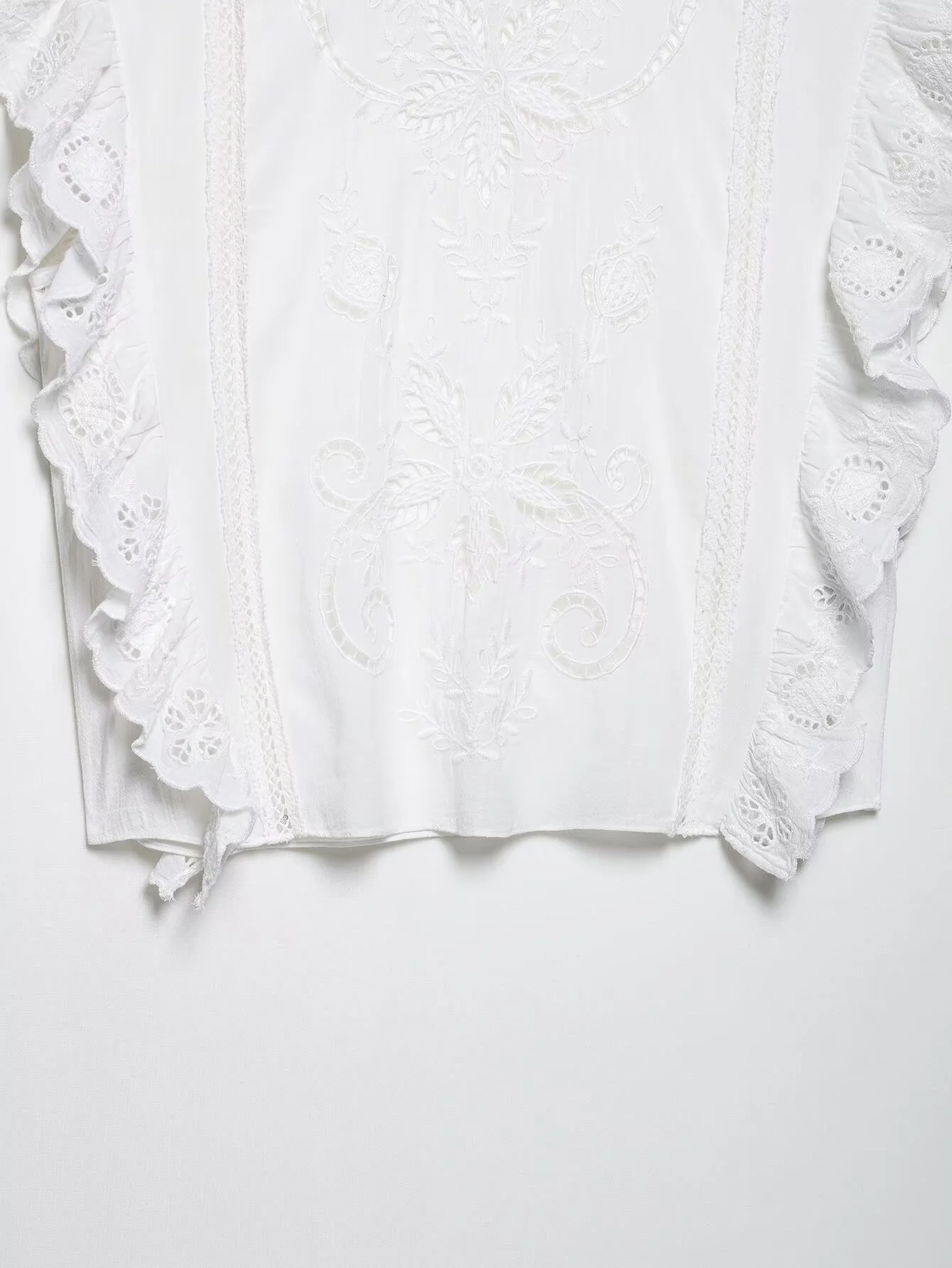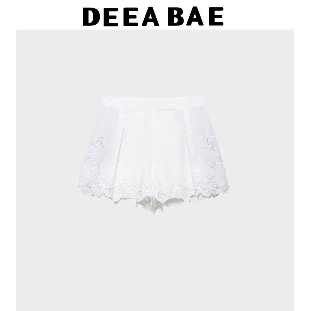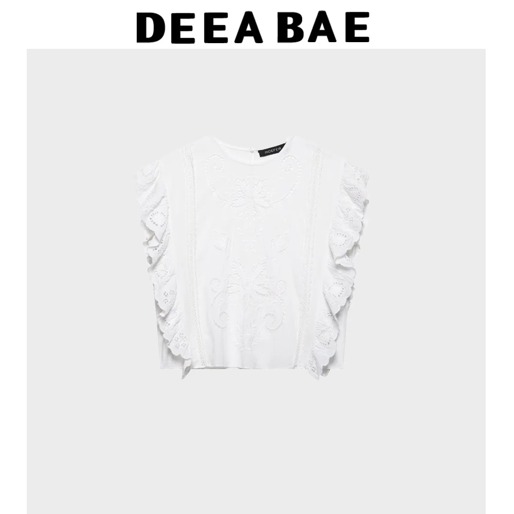 DEEABAE Summer Women's Clothing Romantic Style Loose Round Neck Ruffle Edge Embroidered Hollow Top Embroidered Pleated Shorts