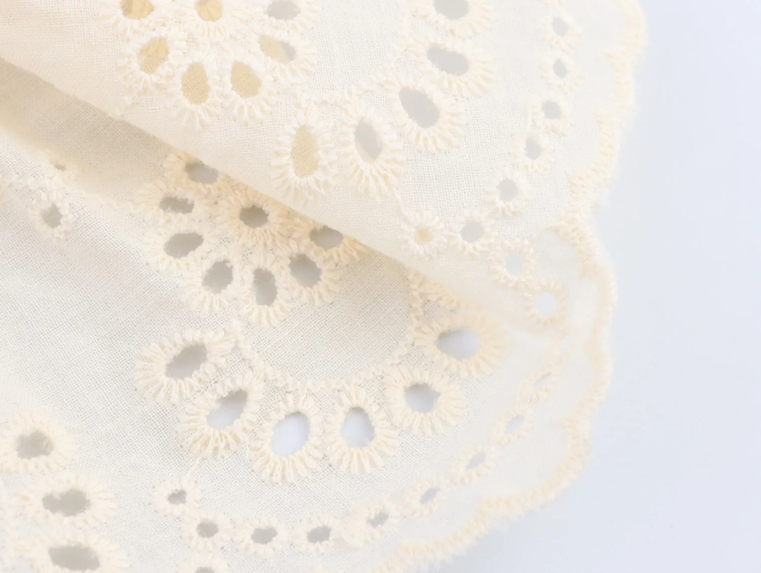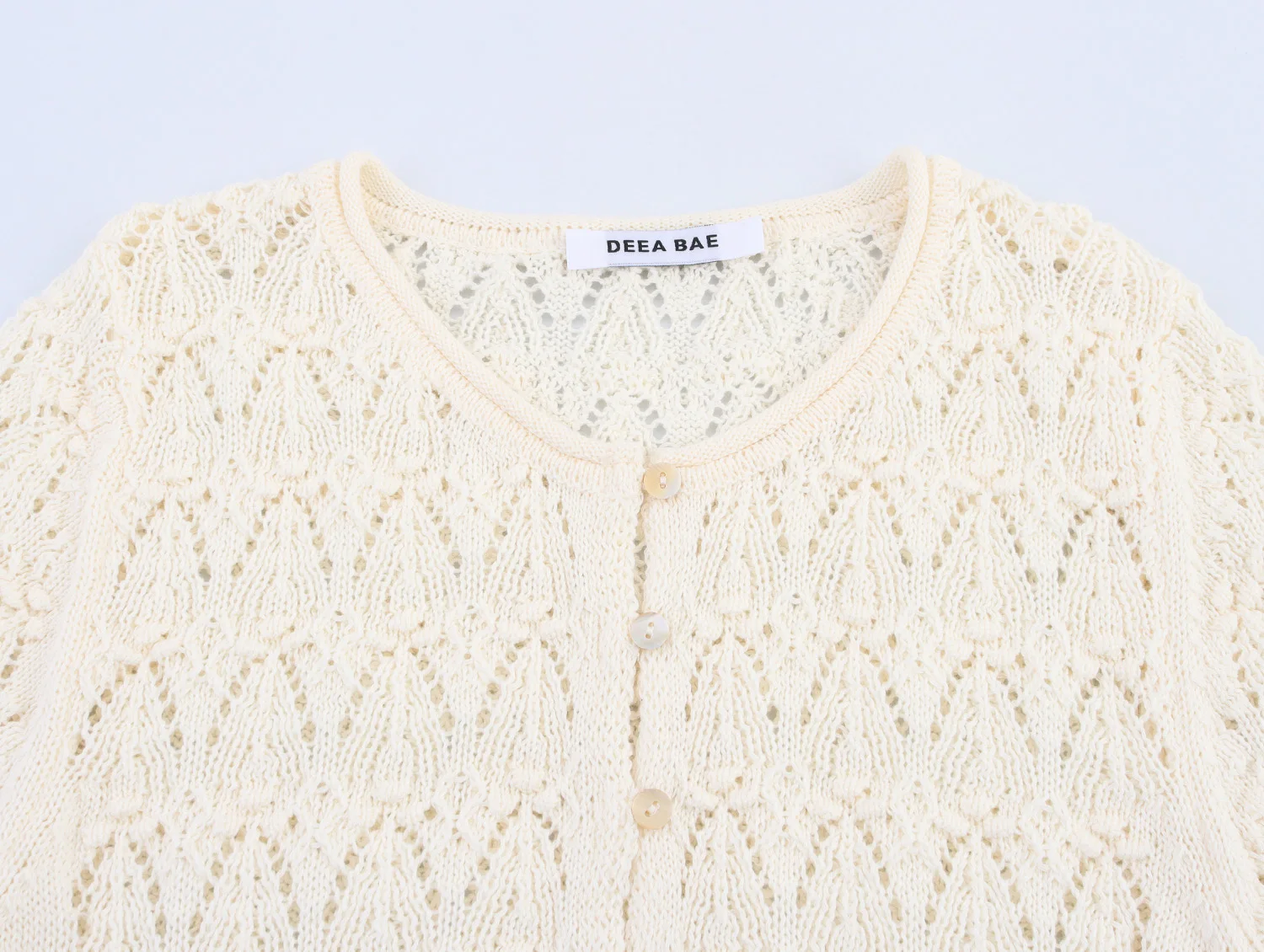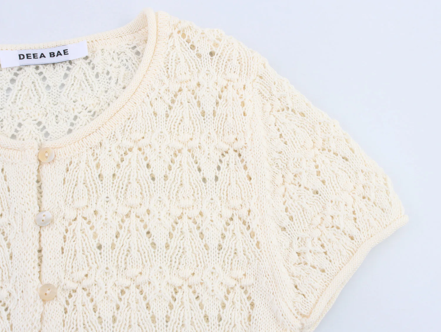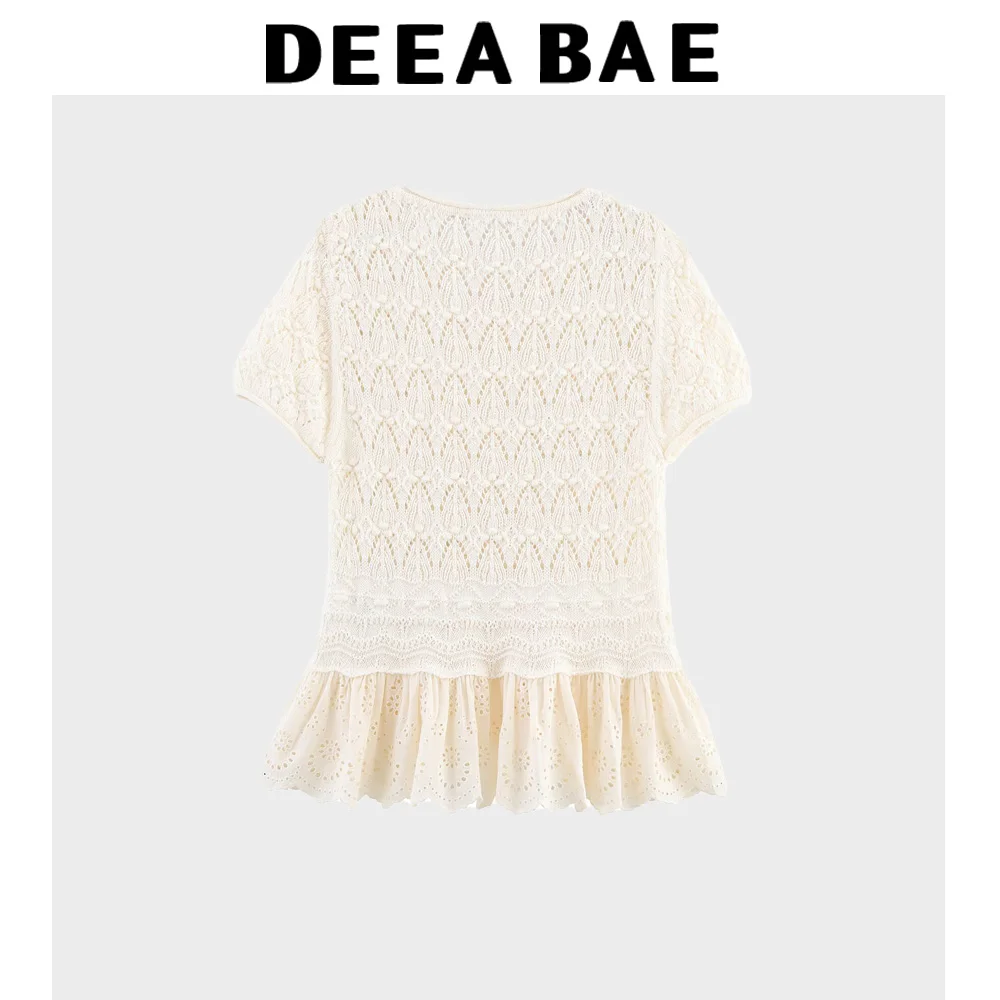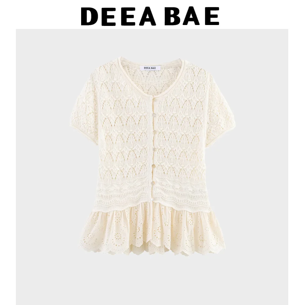 DEEABAE Summer Women’s Hollow Embroidery Decoration Splicing Knitted Romantic Style Round Neck Short Sleeved Top