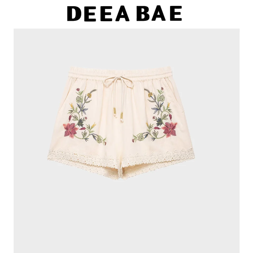 DEEABAE Summer Women's New Vintage Western Style Flower Embroidered Strap Top Mid Waist Casual Shorts Set