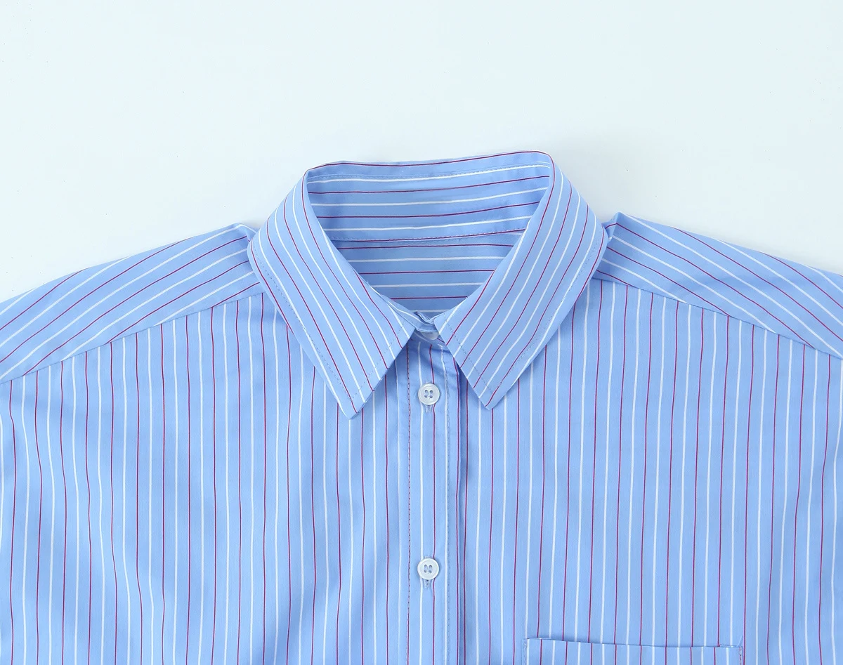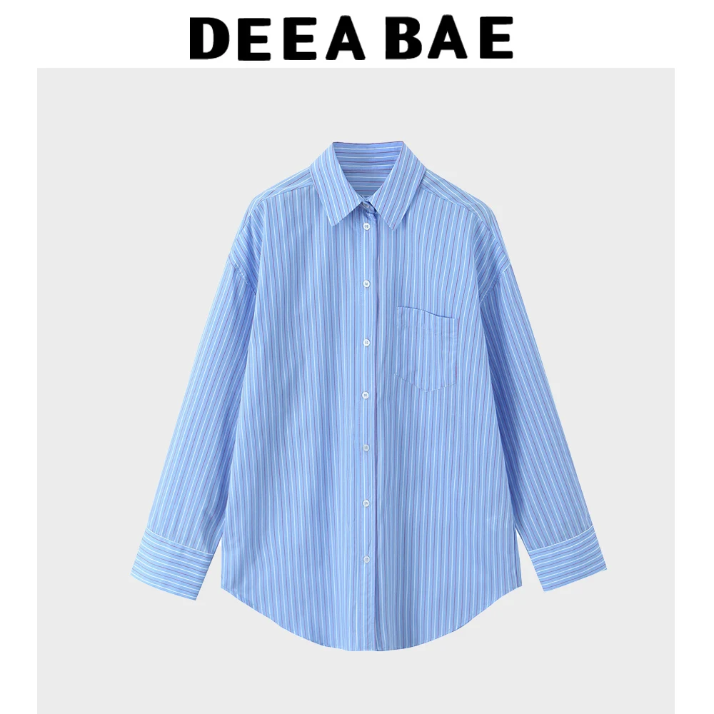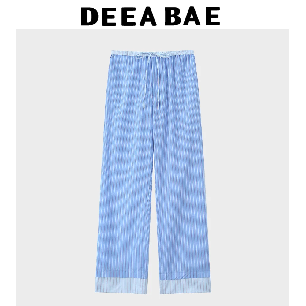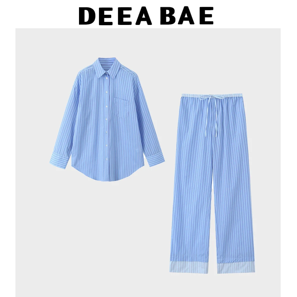 DEEABAE Versatile Poplin Comfortable Striped Loose Long Sleeved Shirt High Waisted Lace Up Striped Pants Wide Leg Pants