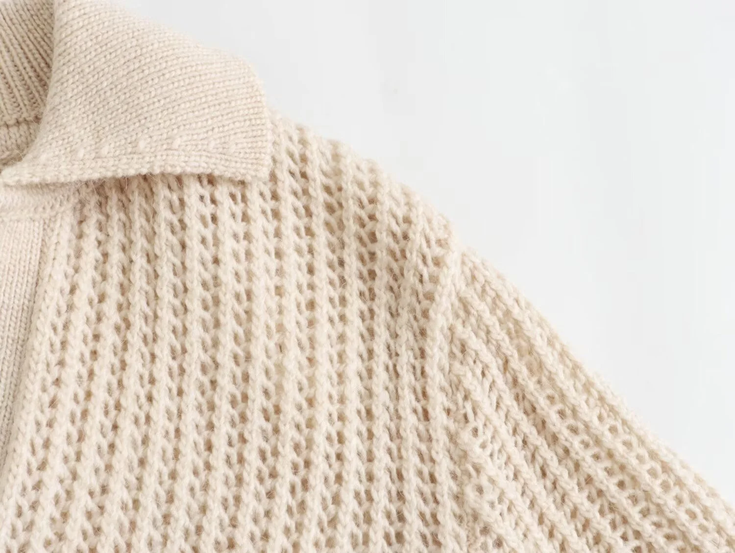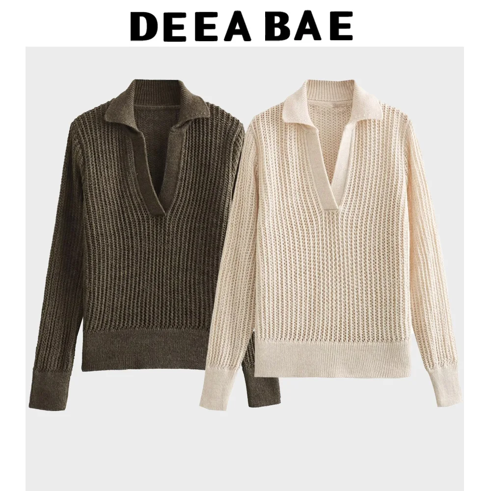 DEEABAE Women Clothing Design Sense Small V-neck Hollow Decoration Stitching Long Sleeve Knitted Top Loose Slim Pullover Sweater