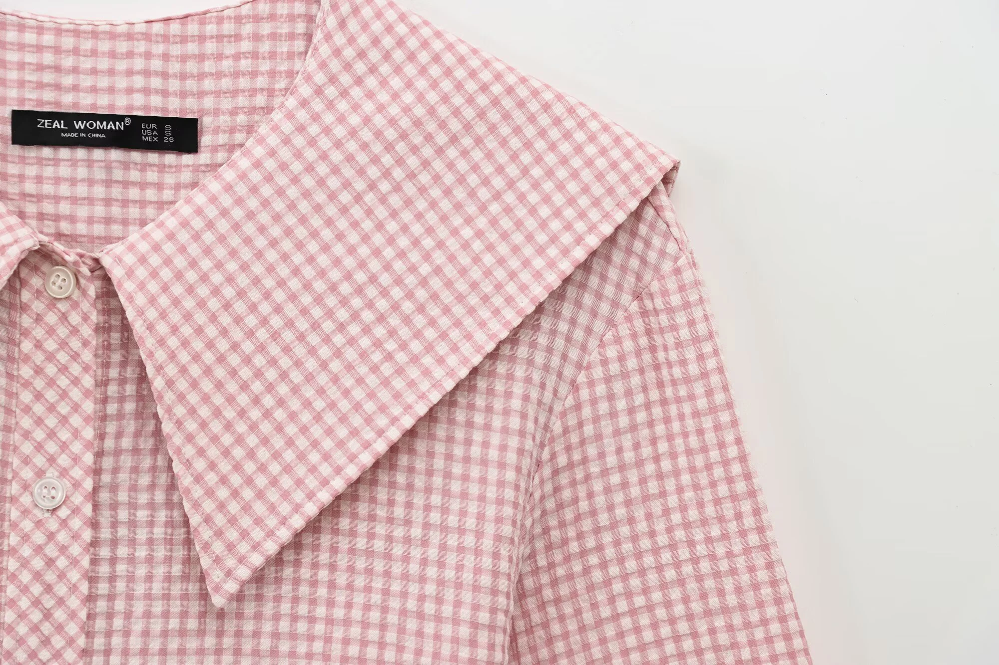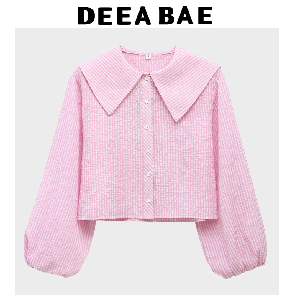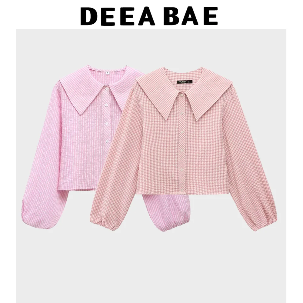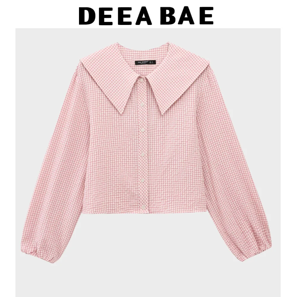 DEEABAE Women’s Blouses Free Shipping Offers New Sweet Small Round Lapel Small Plaid Puff Long Sleeve Shirt Top