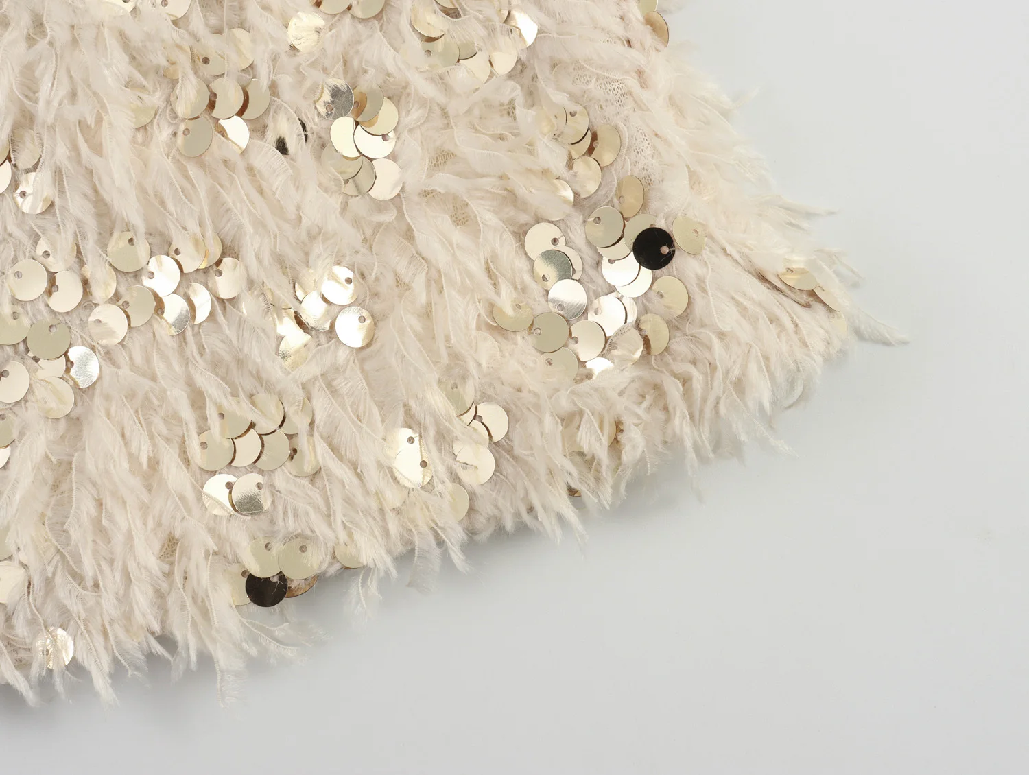 Sexy Women Sequins Tassel Feather Spaghetti Strap Dresses Slim V-Neck Off Shoulder Dress Evening Pa...