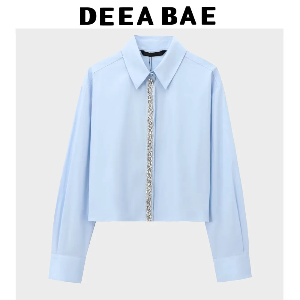 DEEABAE Women's Clothing Offers With Free Shipping Casual Lapel Long Sleeve Jeweled Poplin Short Shirt