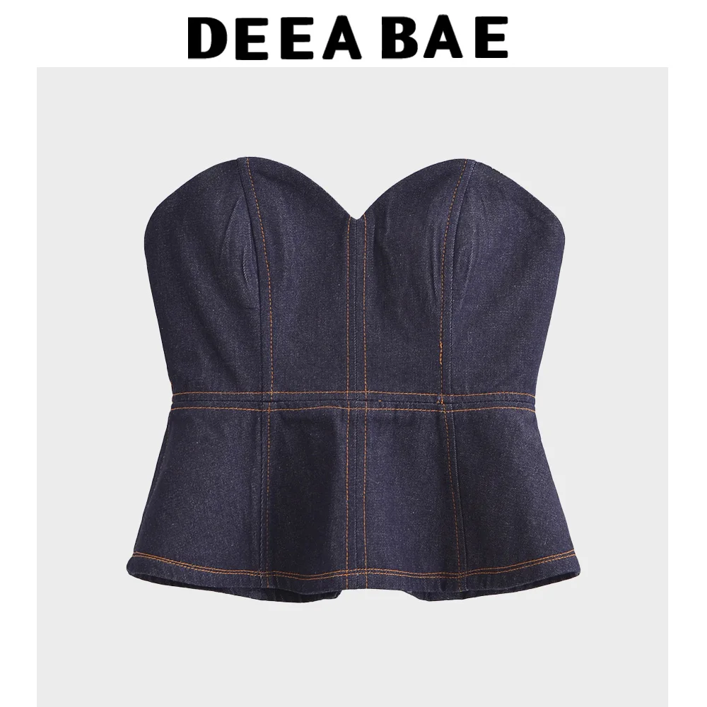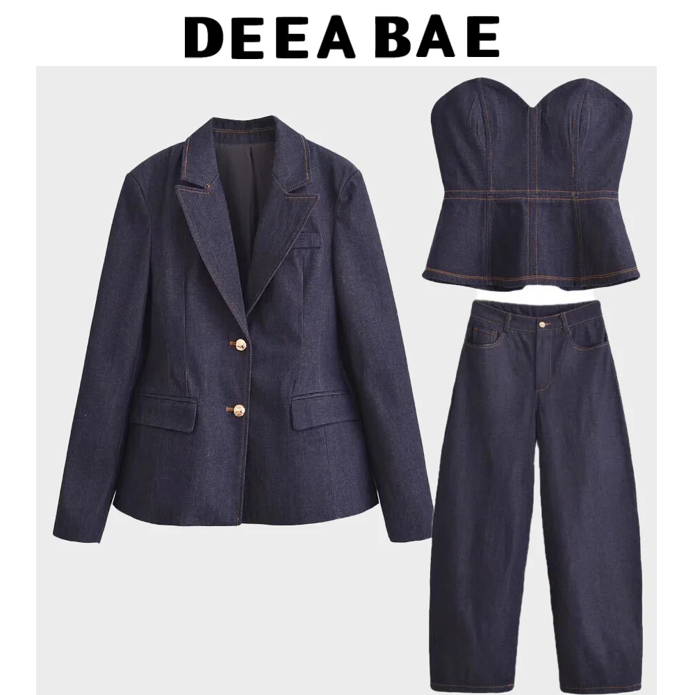 DEEABAE Women's New Fashionable Spicy Girl Style Slim Fit Waist Pocket Decoration Denim Jacket Strapless High Waisted Pants Set