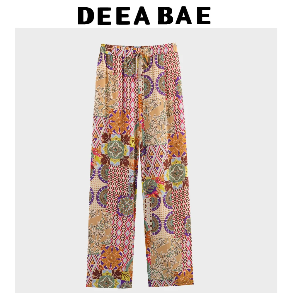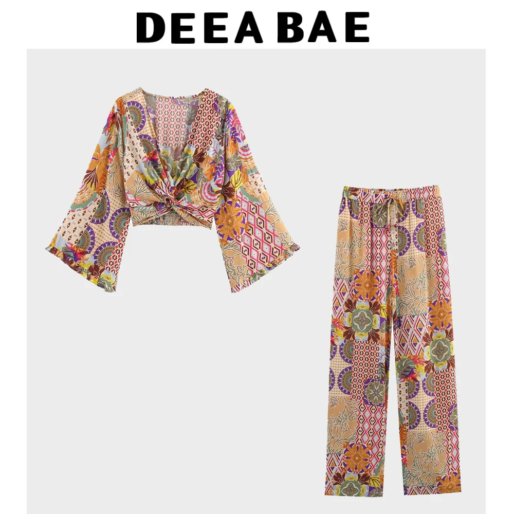 DEEABAE Women's New Vacation Style Printed Long Sleeved V-neck Top Printed Loose High Waisted Casual Pants
